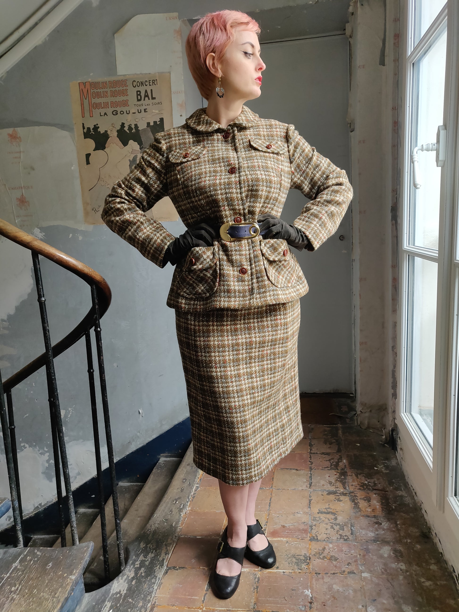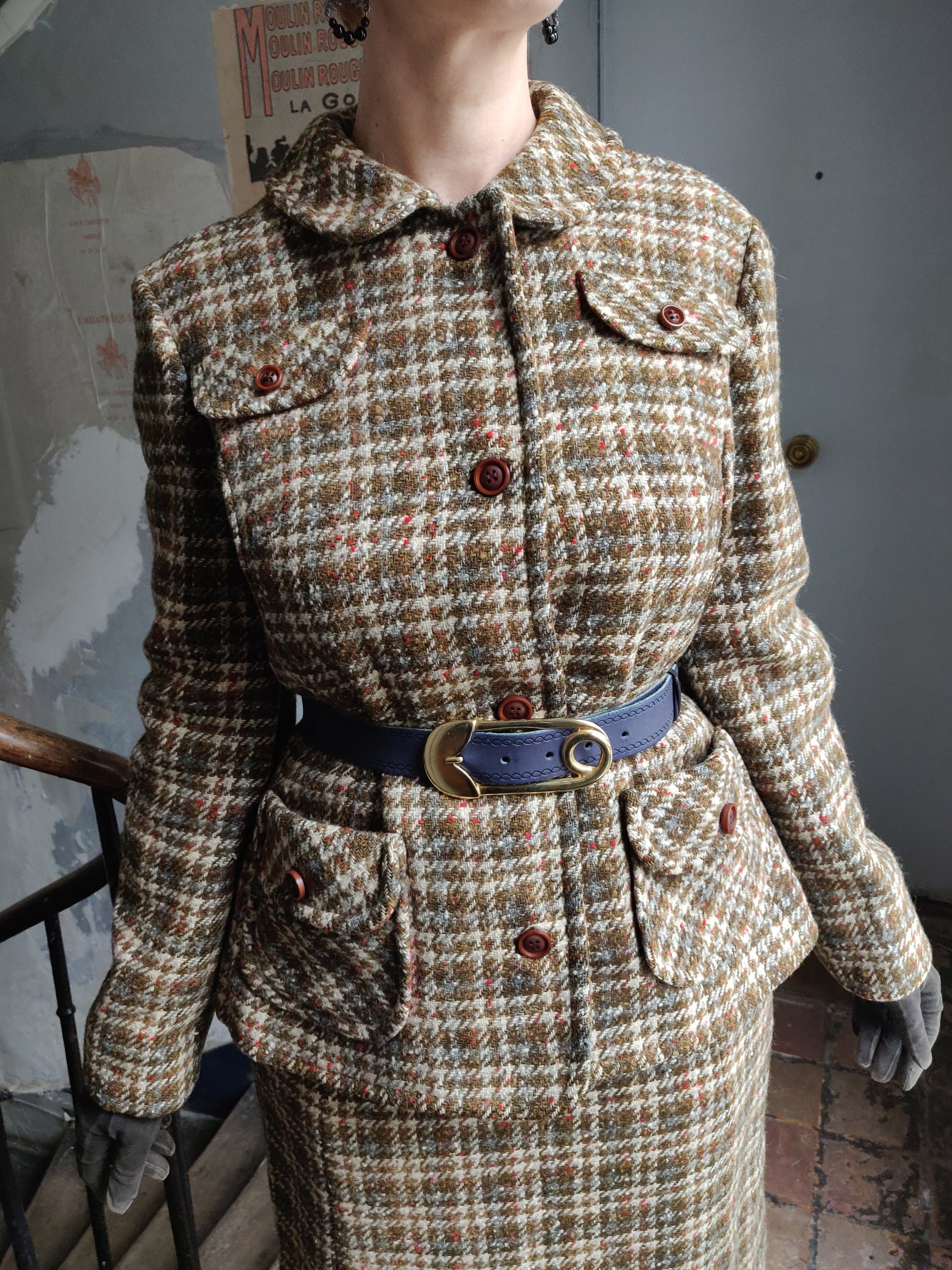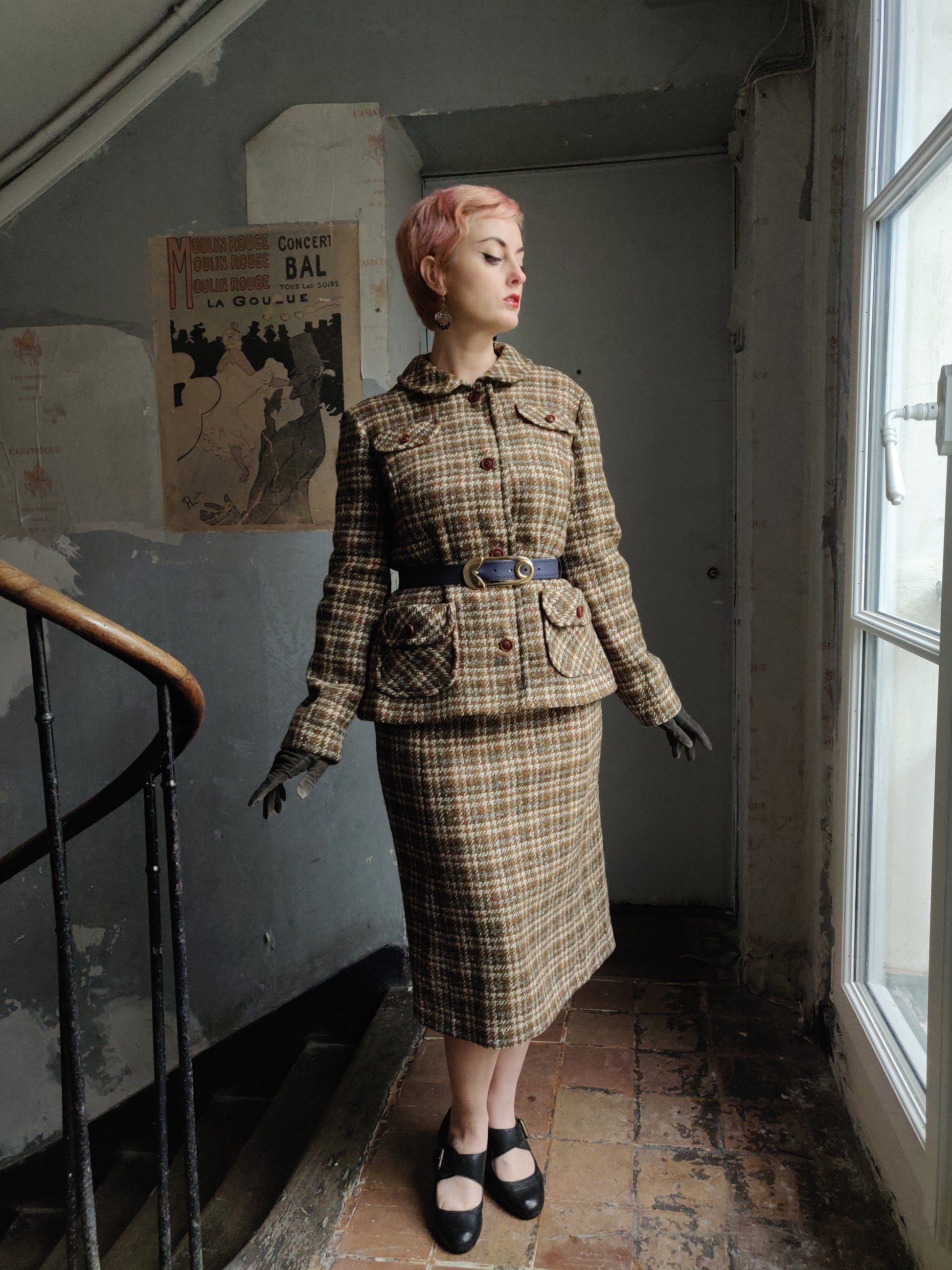 his elegant, houndstooth plaid skirt and jacket set comes to you from the personal collection of Adèle Mildred.