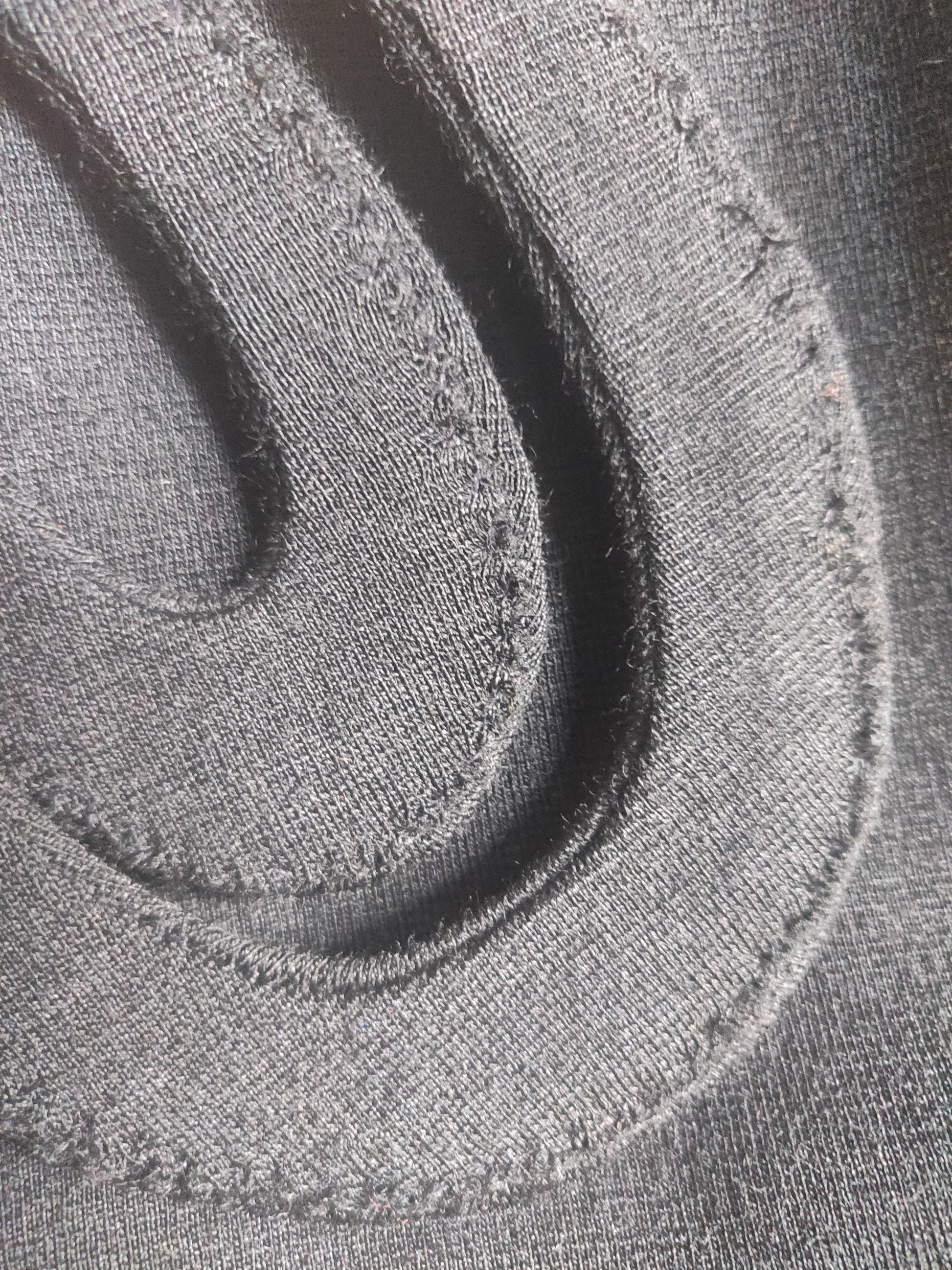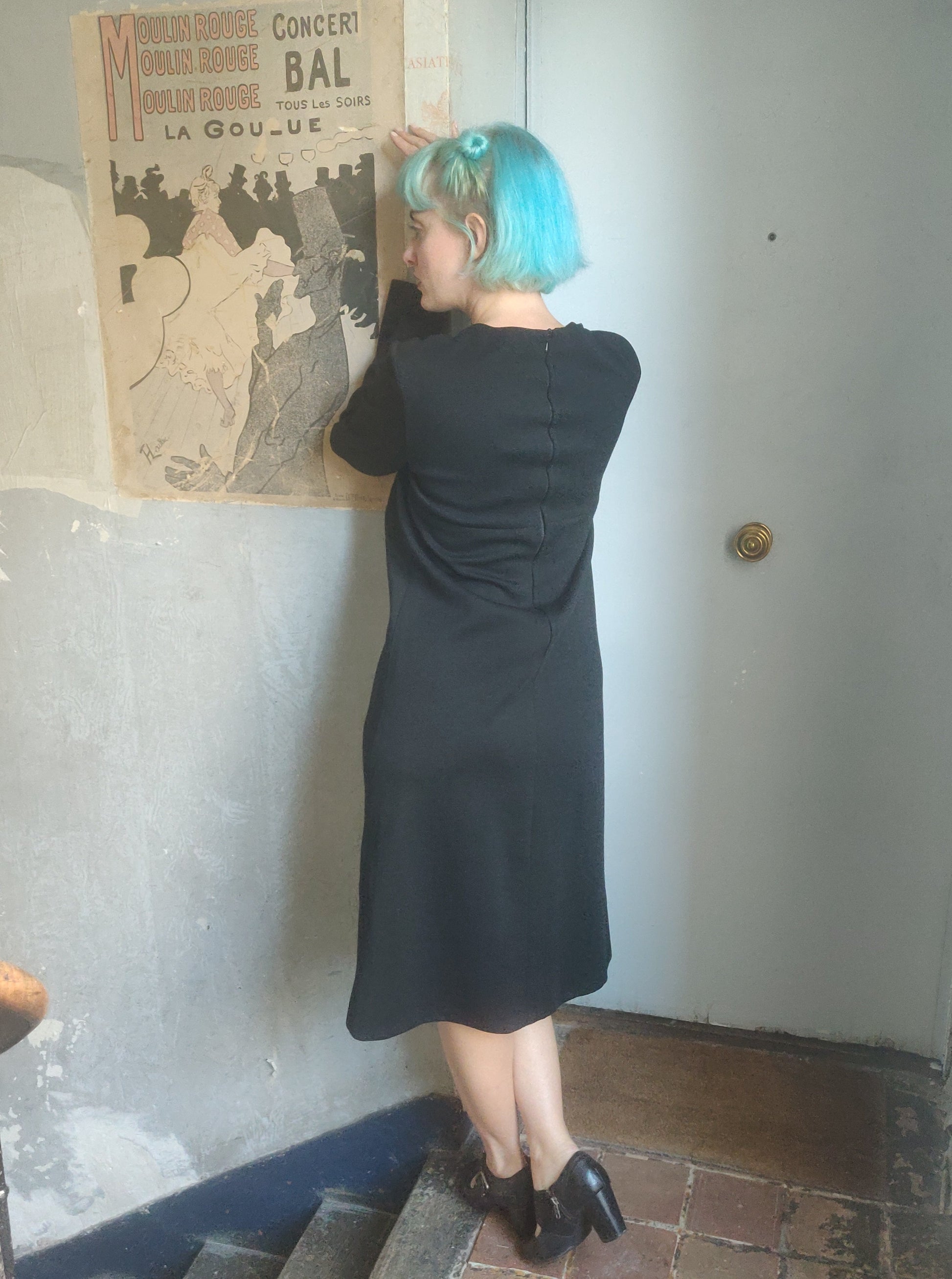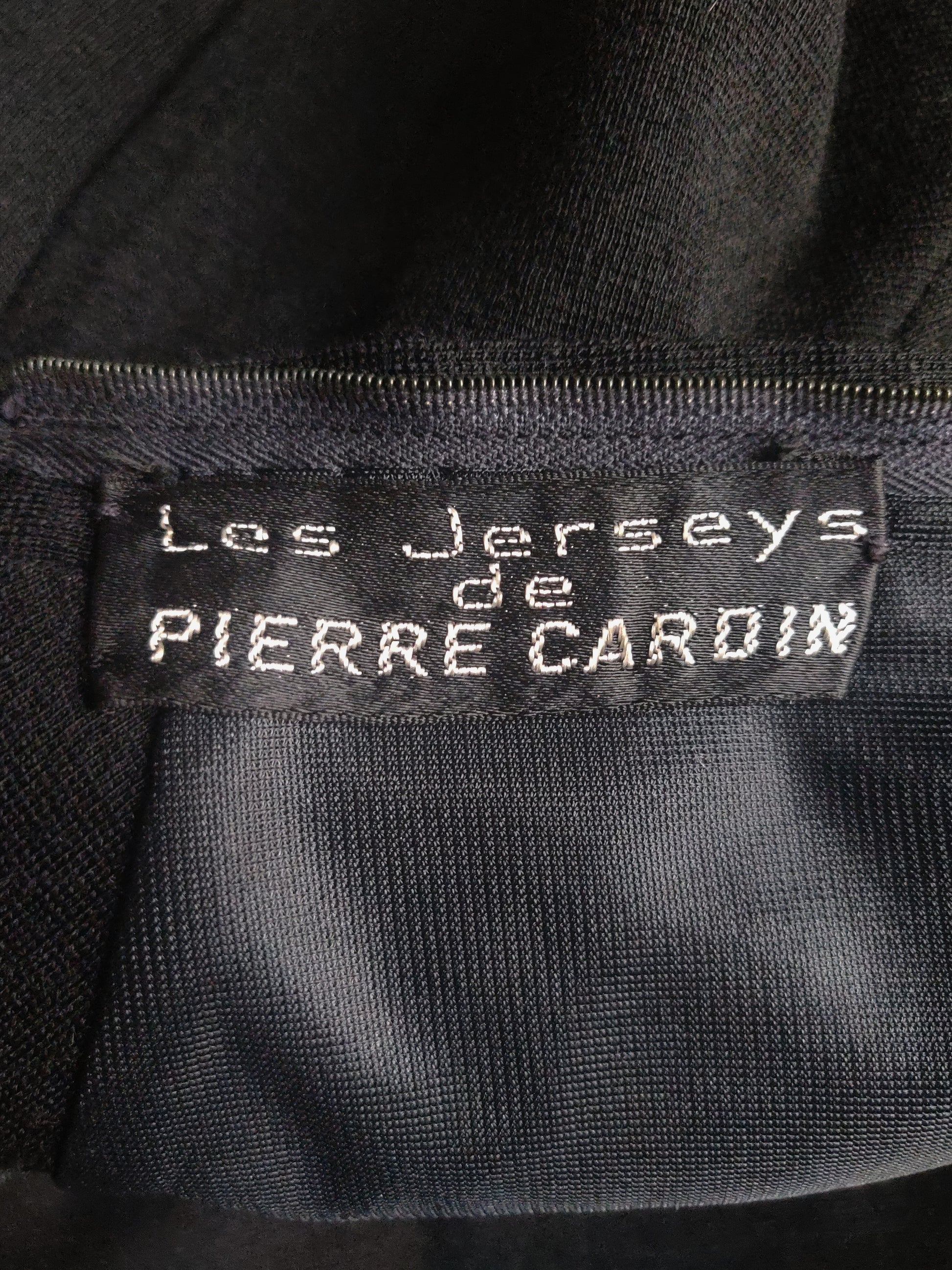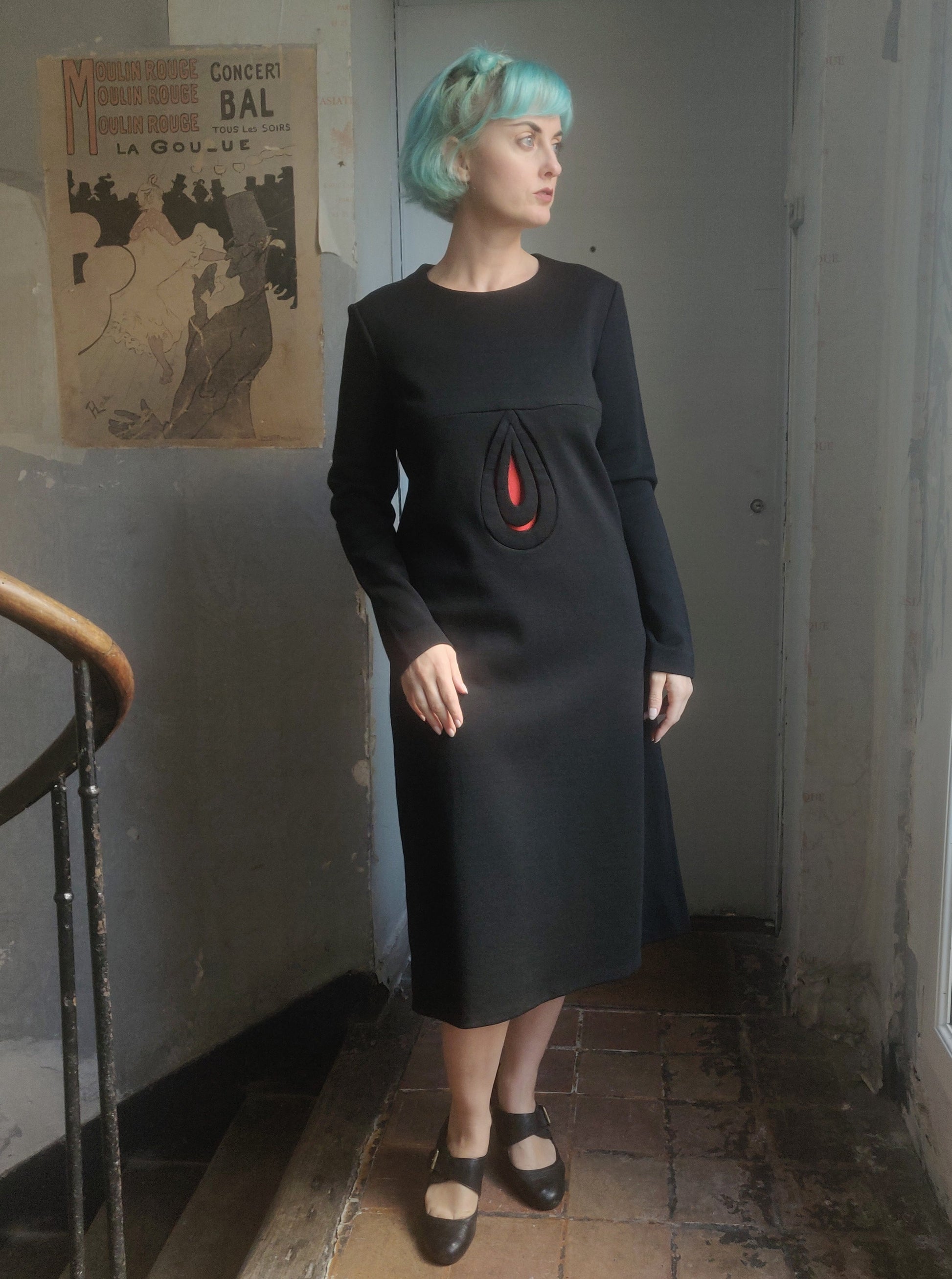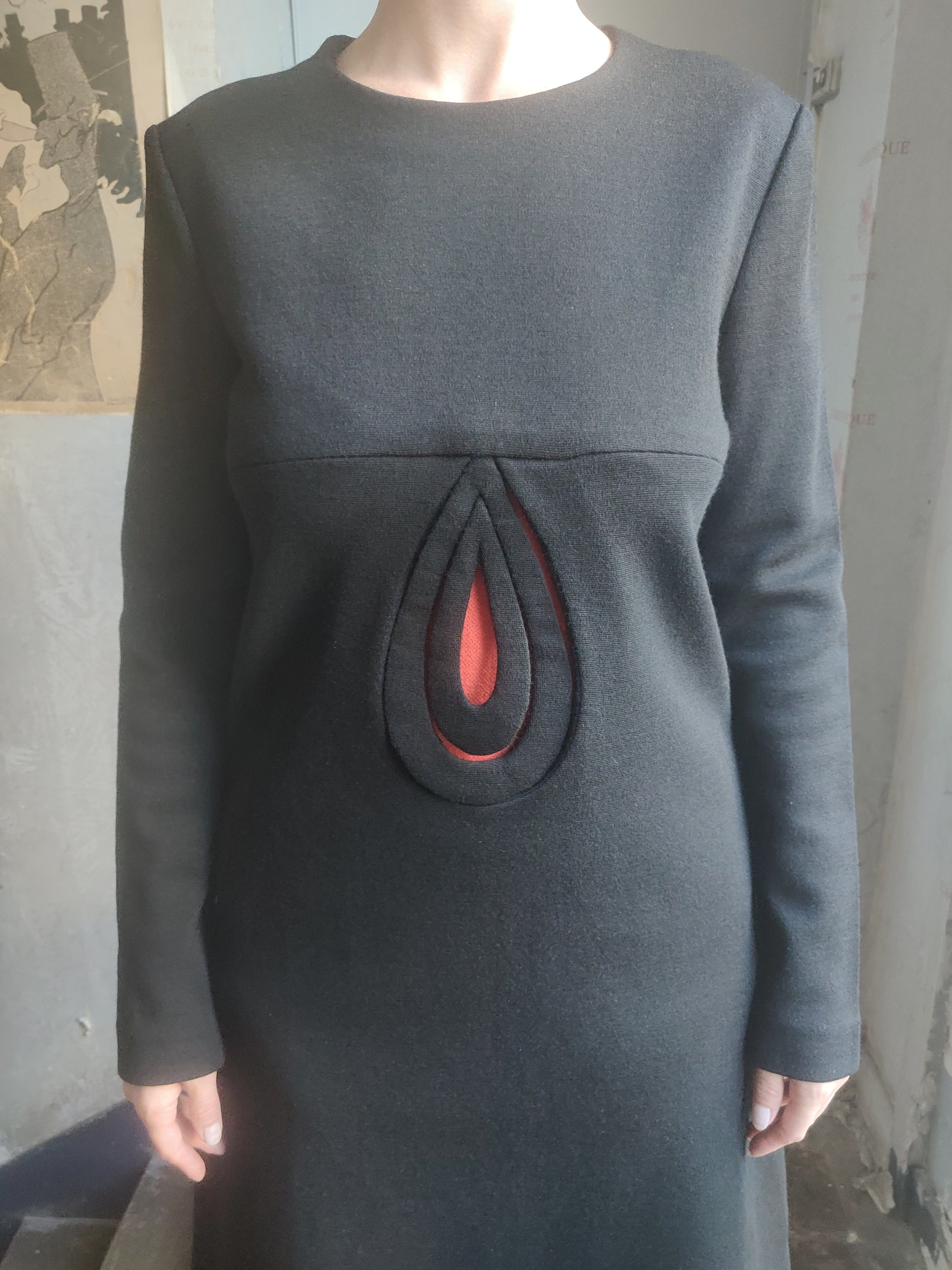 This rare, late 1960s Pierre Cardin "space age" dress is an extraordinary example of his work at that time. It's made of a heavy wool jersey and features a blood orange droplet cut out in the front. It's hand-finished, as can be seen in photos 7 and 8.