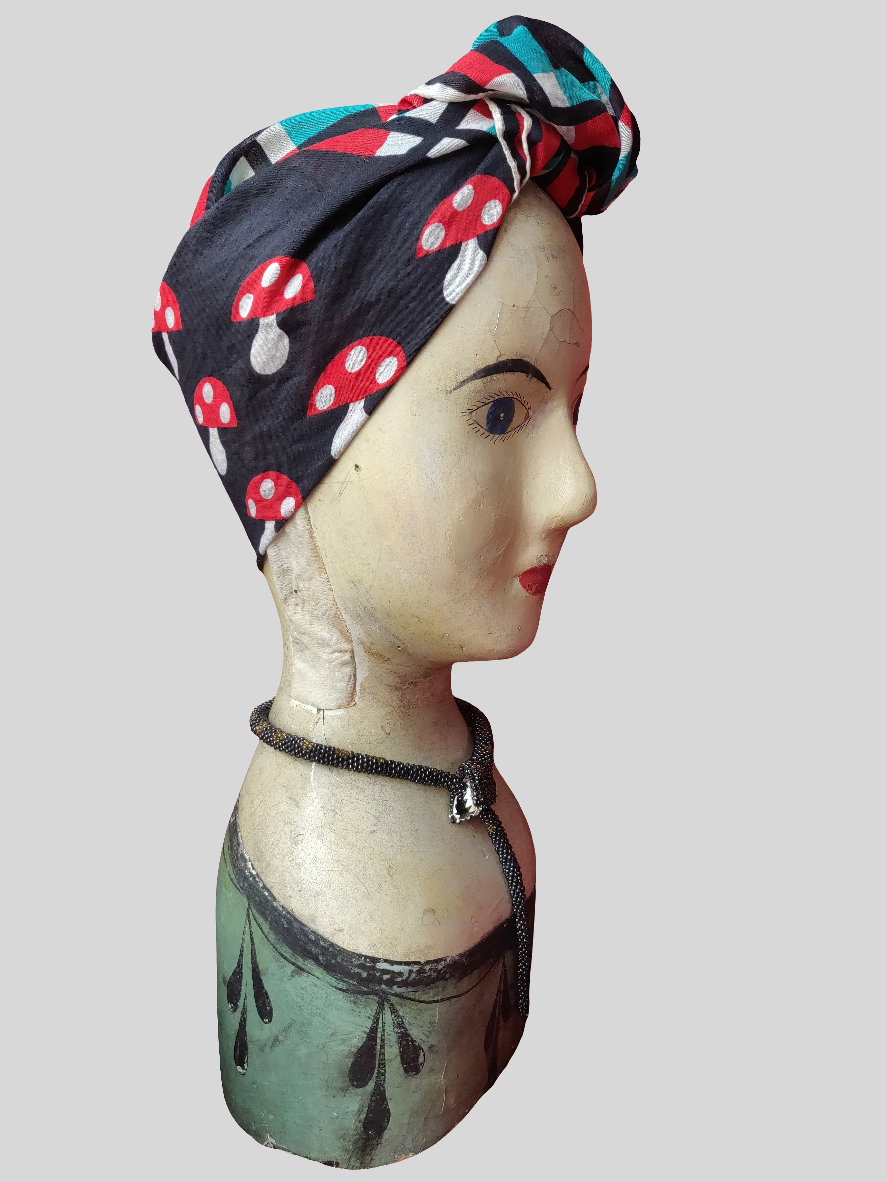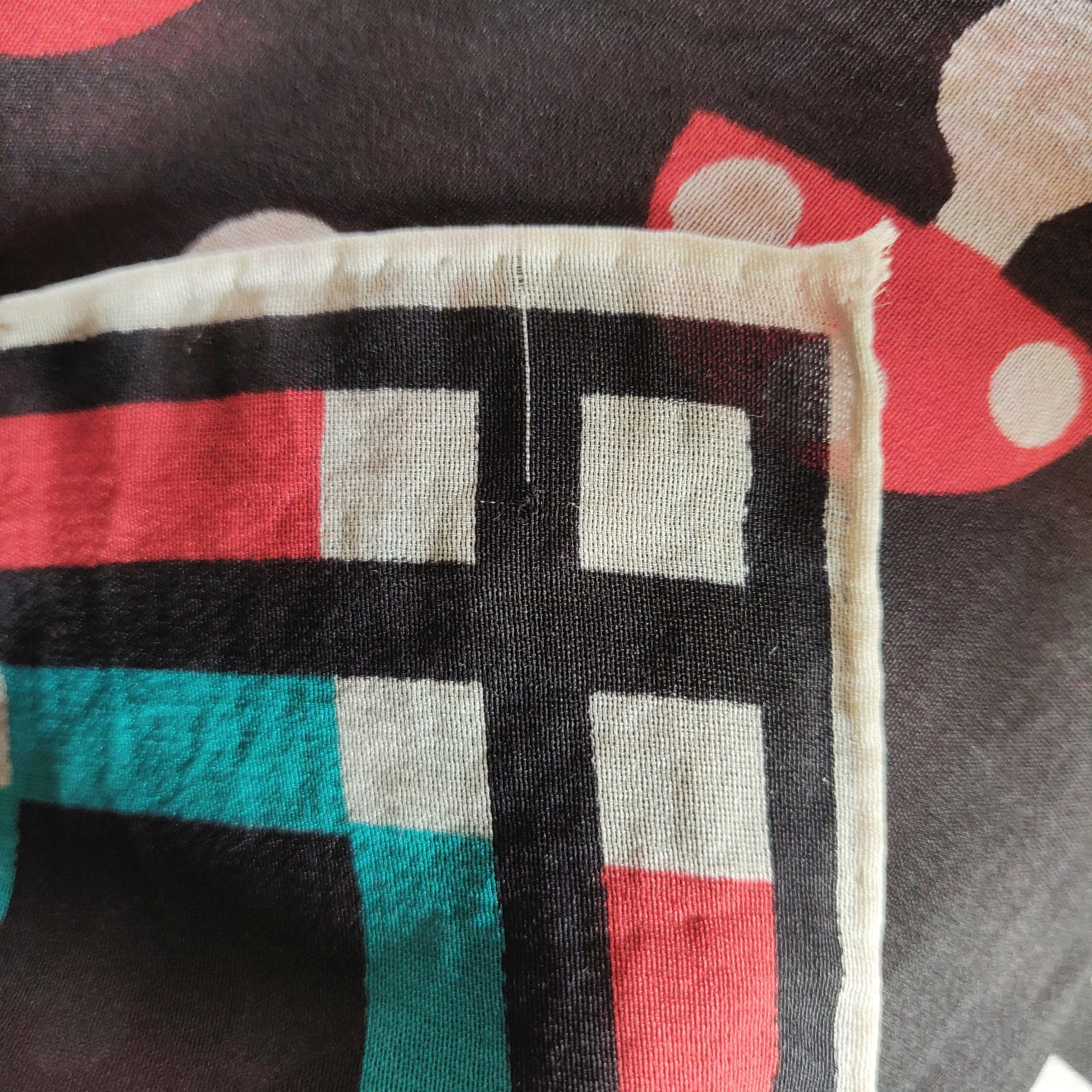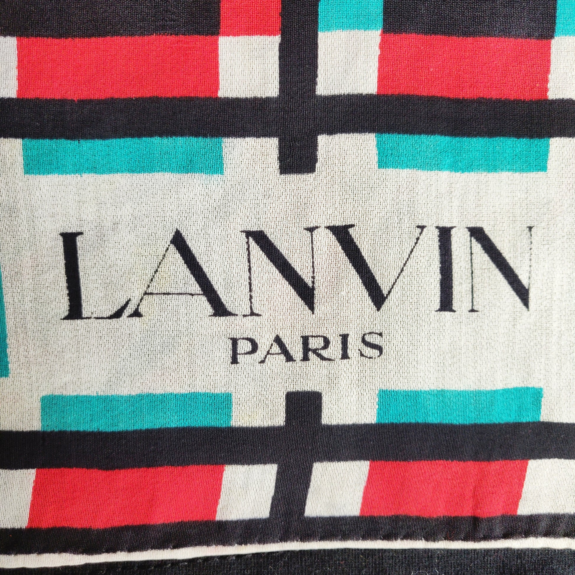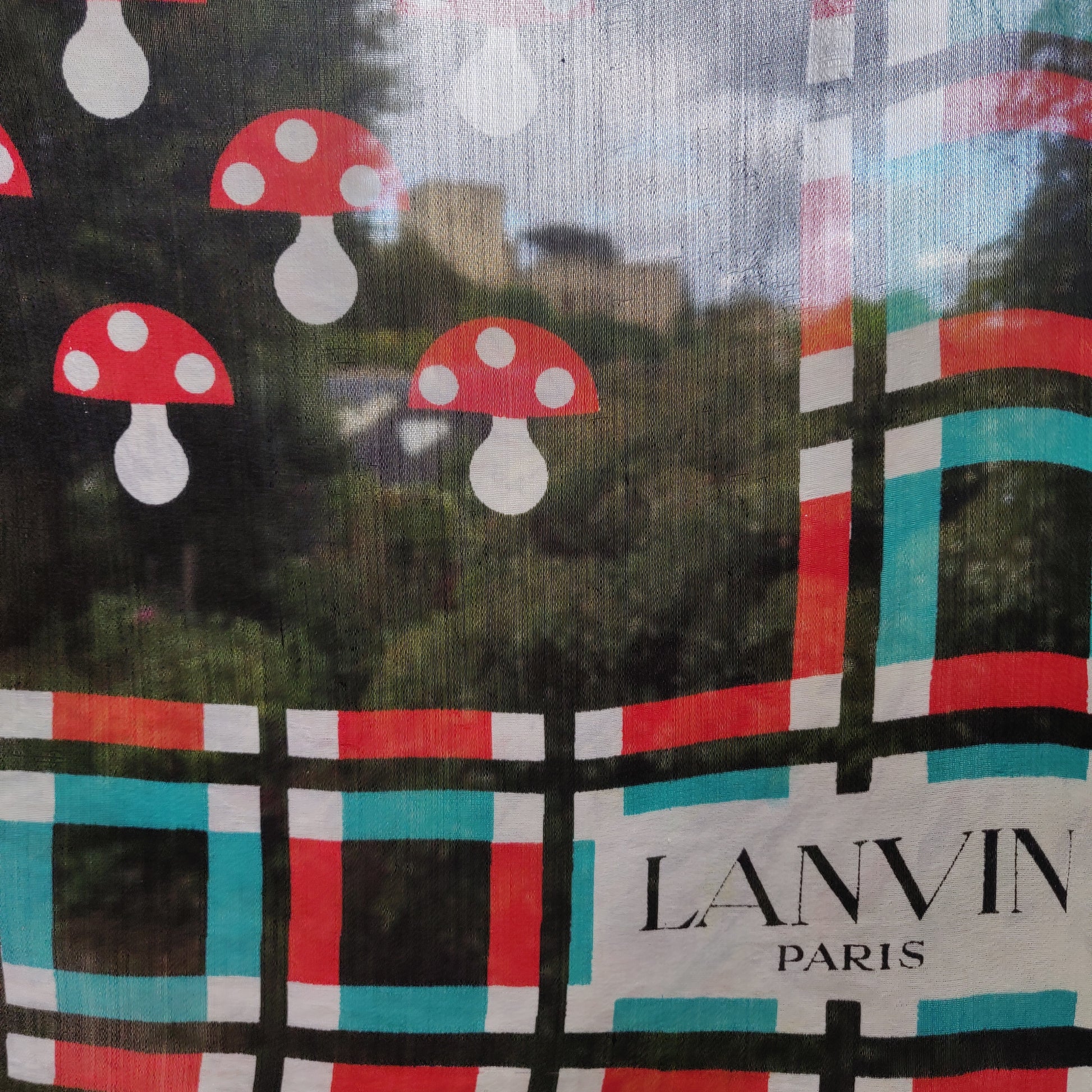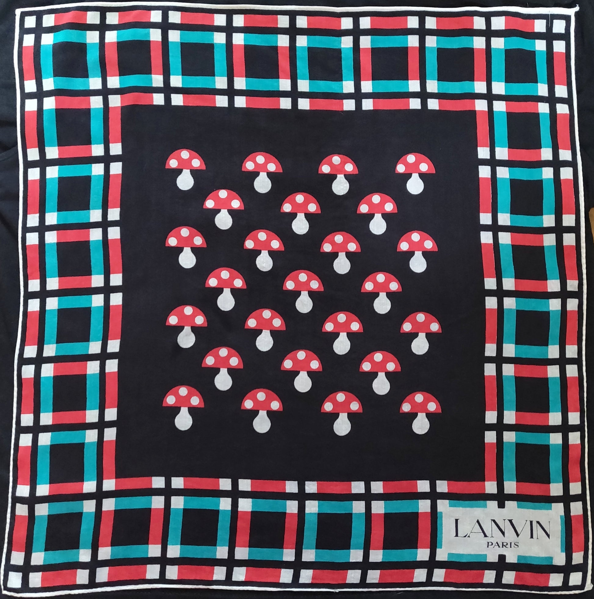 I think this '70s Lanvin scarf is absolutely adorable, featuring the cutest little mushrooms in the center of a bright red, dark teal and white check border on a black background. It is signed "Lanvin Paris" in the corner.