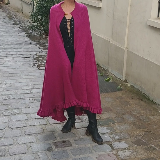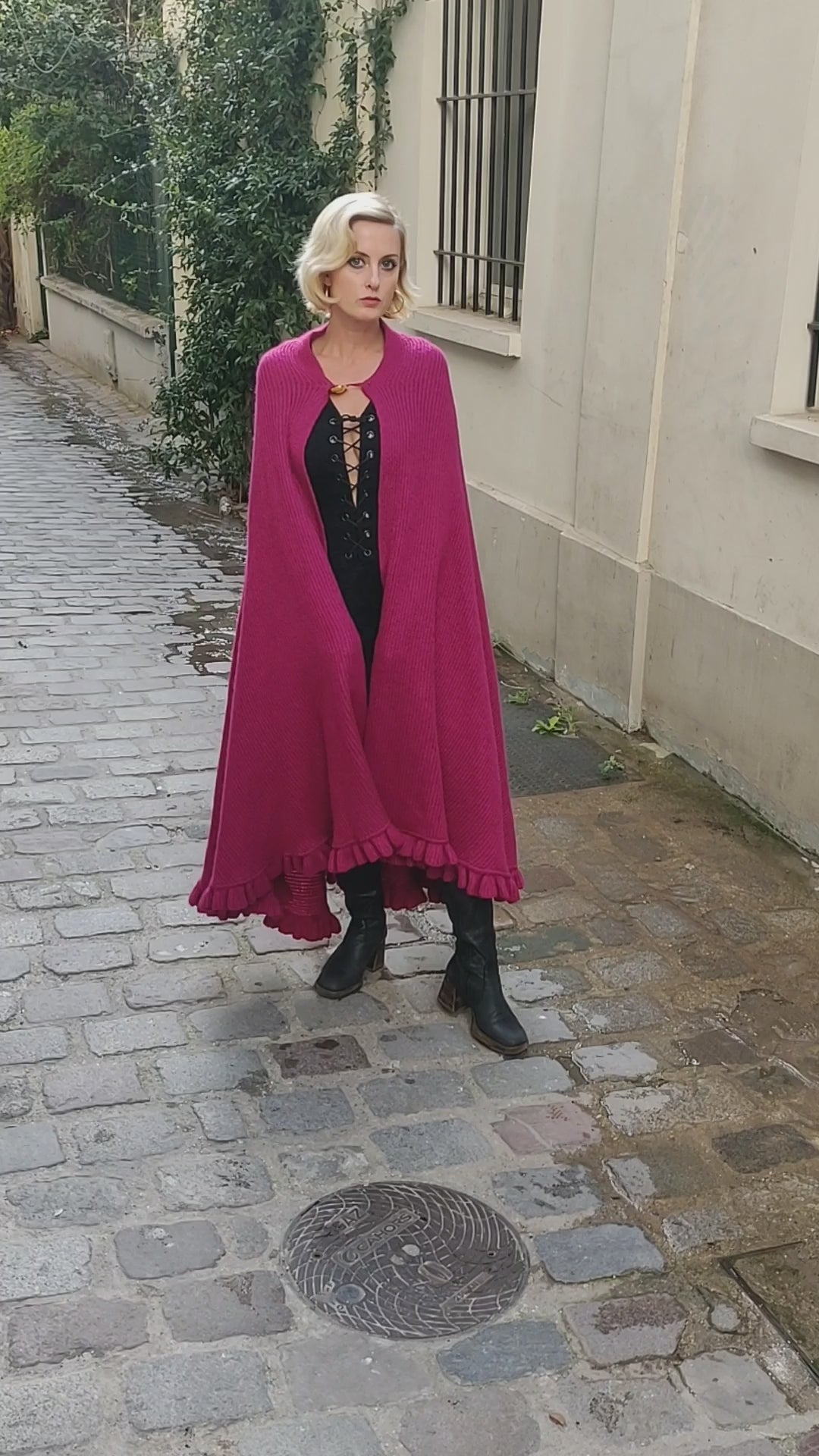 The first thing that won me over was the absolutely elegant way it drapes and moves. I mean, look at that sweeping movement in the video! Almost makes me change my mind about selling it. And the ruffled trim is just too pretty! This cape is basically a luxurious, raspberry pink blanket that fastens around your shoulders.