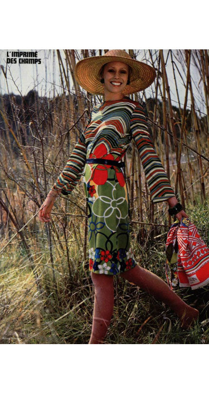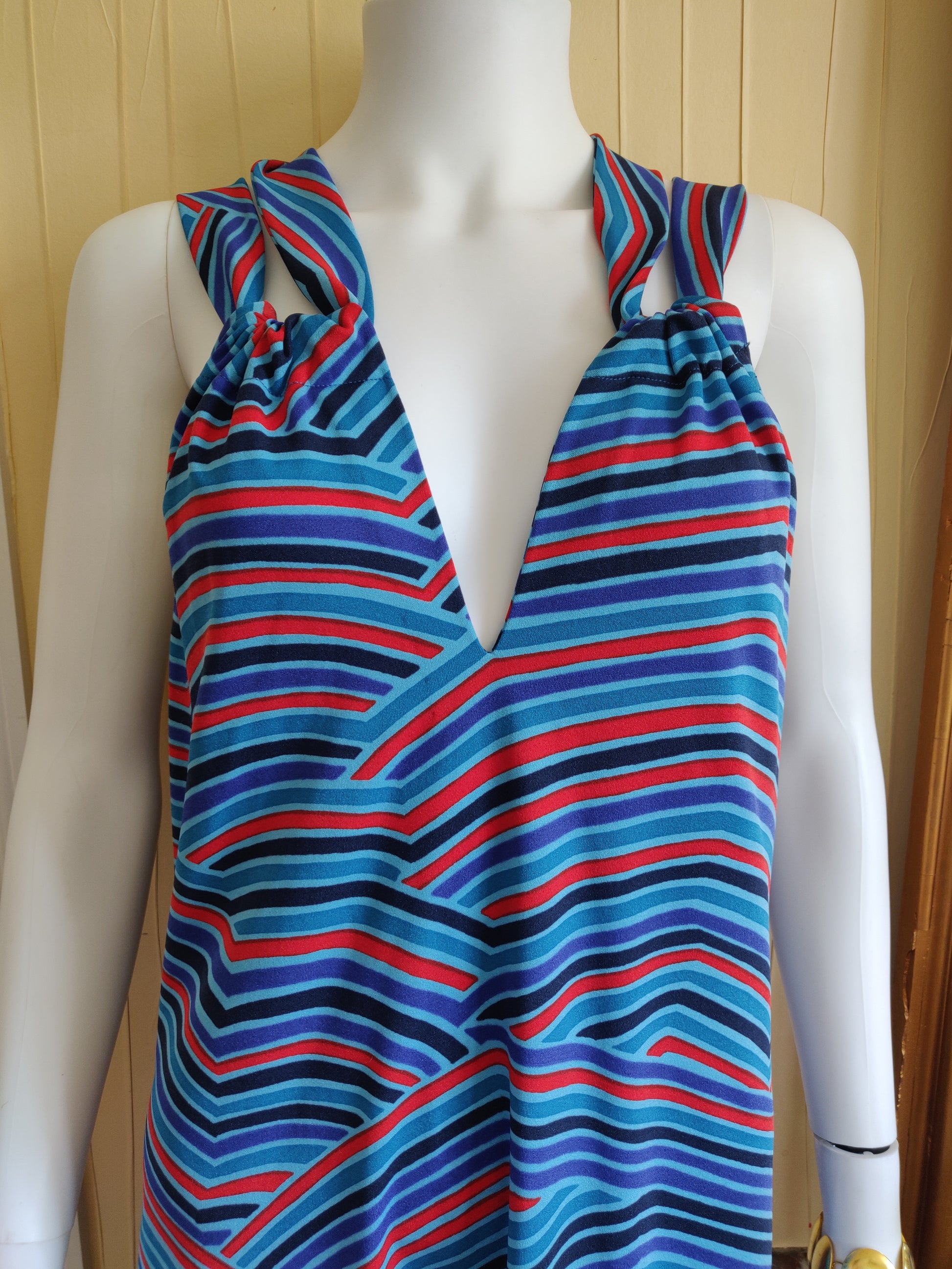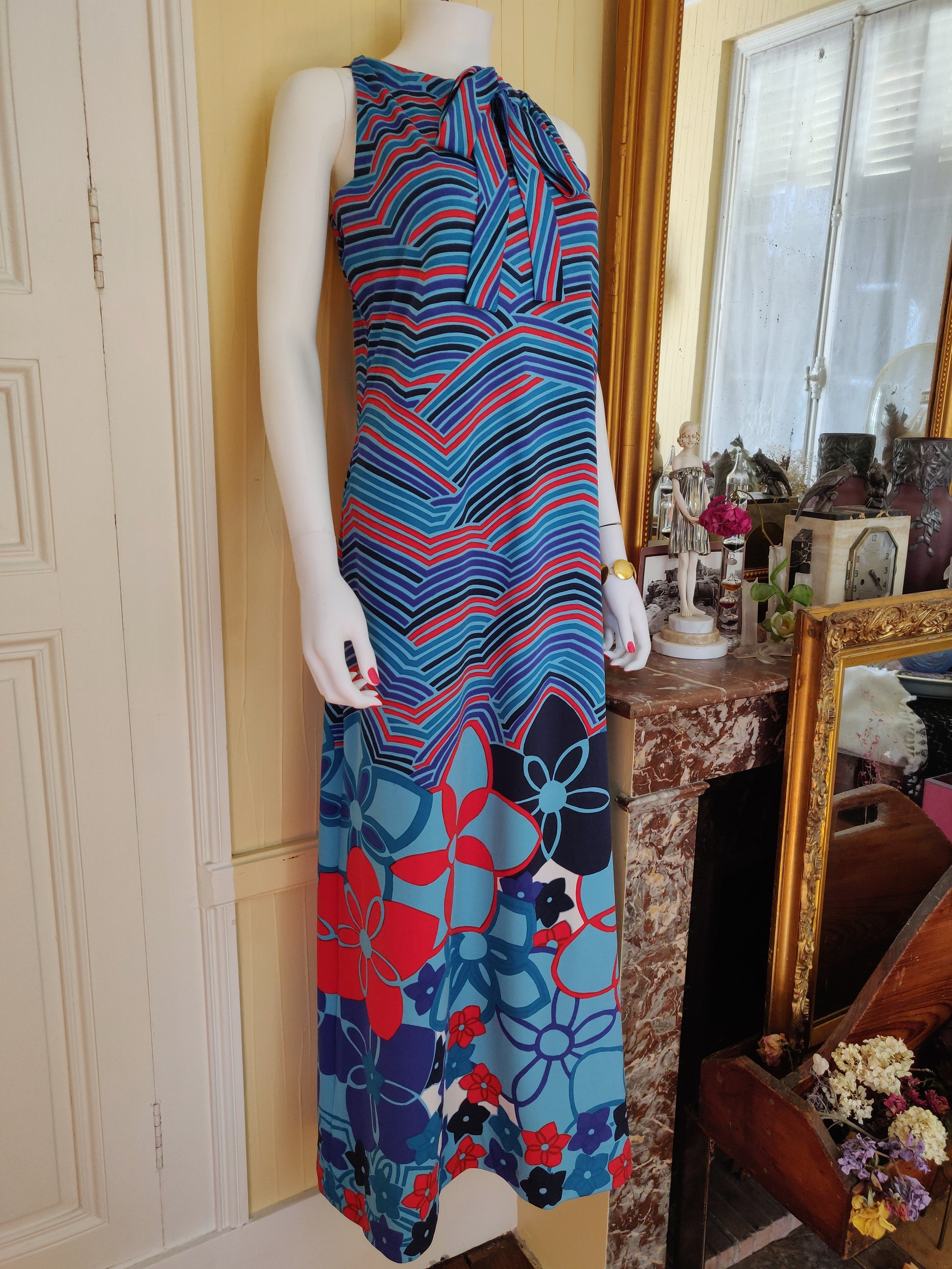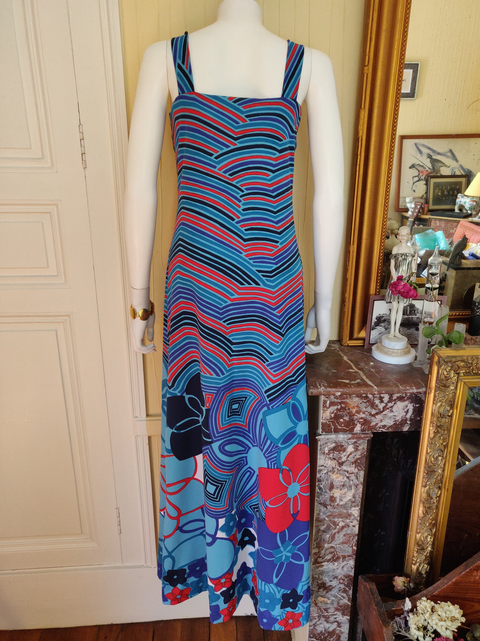 Believe me when I tell you that this piece of fashion history is absolutely marvelous! It may seem like a simple cut but the way it fits and falls is perfection. Thanks to its poly jersey material it's just about impossible to wrinkle, making it a brilliant travel dress. Unpack and wear! And then of course there's the spectacular print: an abstract optical art floral design in shades of blue and peeps of white with eye-popping red accents. 1970s French divinity.