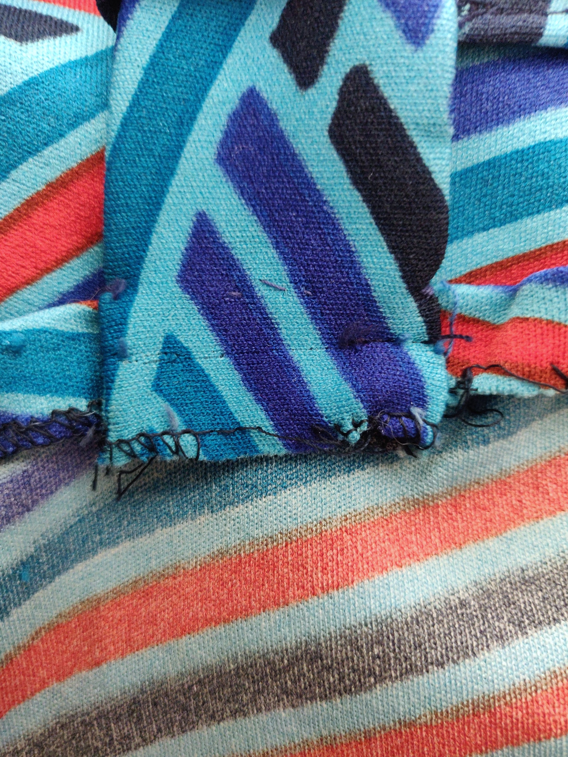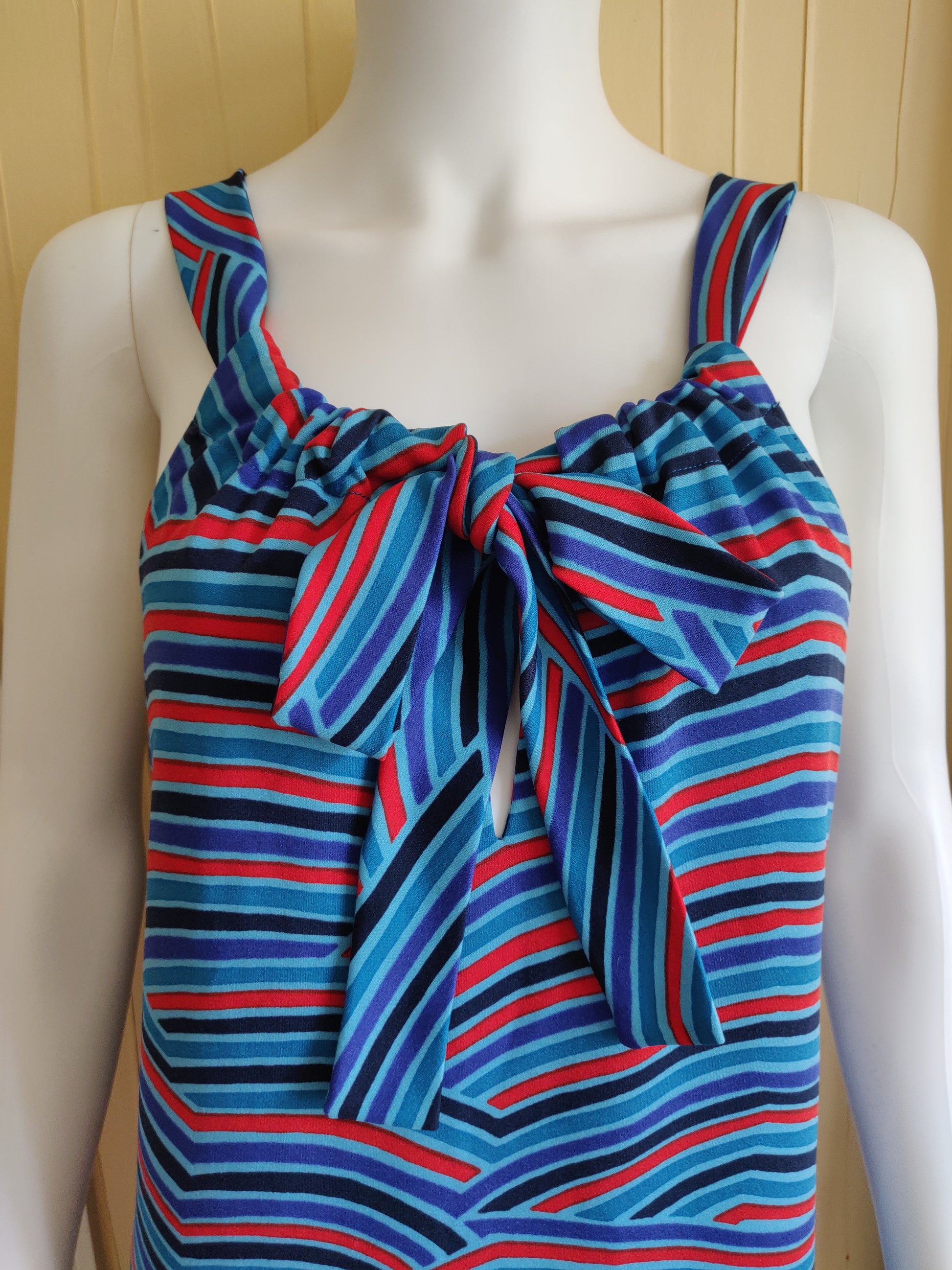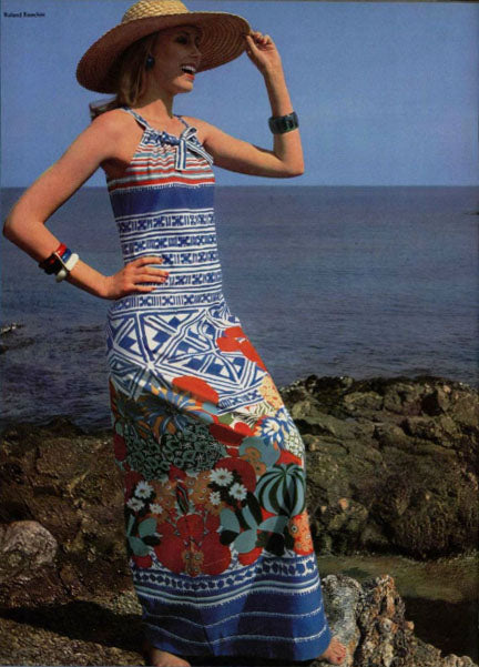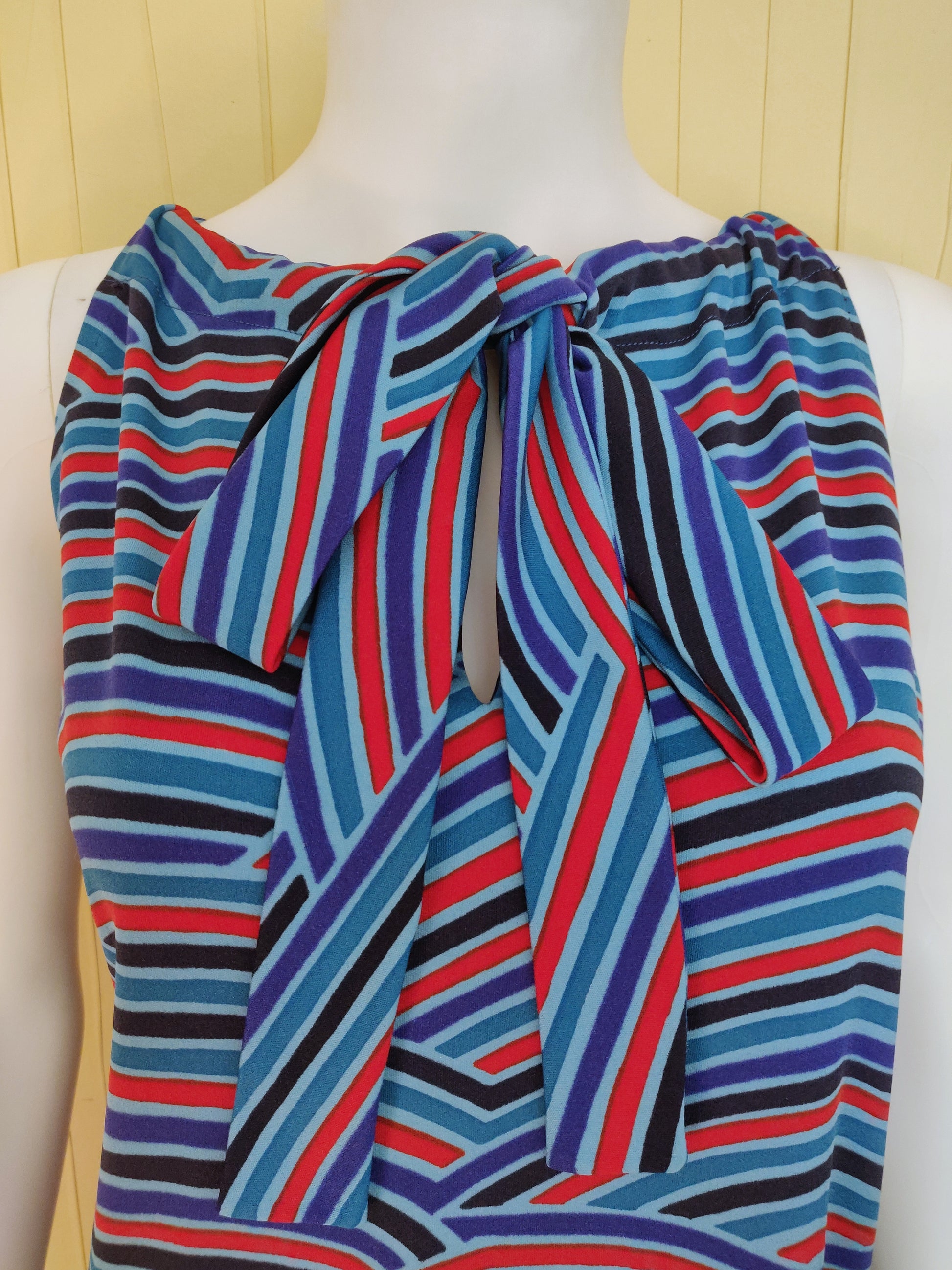 Believe me when I tell you that this piece of fashion history is absolutely marvelous! It may seem like a simple cut but the way it fits and falls is perfection. Thanks to its poly jersey material it's just about impossible to wrinkle, making it a brilliant travel dress. Unpack and wear! And then of course there's the spectacular print: an abstract optical art floral design in shades of blue and peeps of white with eye-popping red accents. 1970s French divinity.