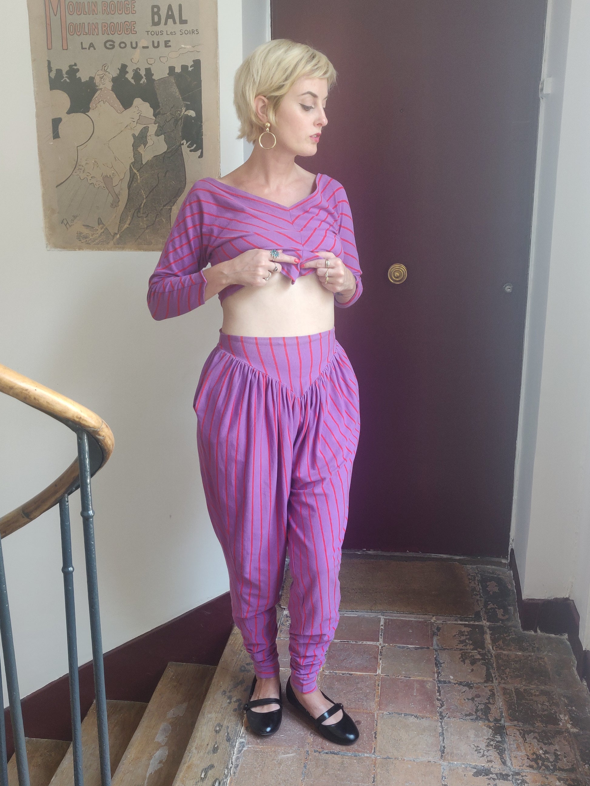 From the eye-catching colors to the fun and flattering cut to its comfort and originality, this early Betsey two-piece jumpsuit is pure joy!