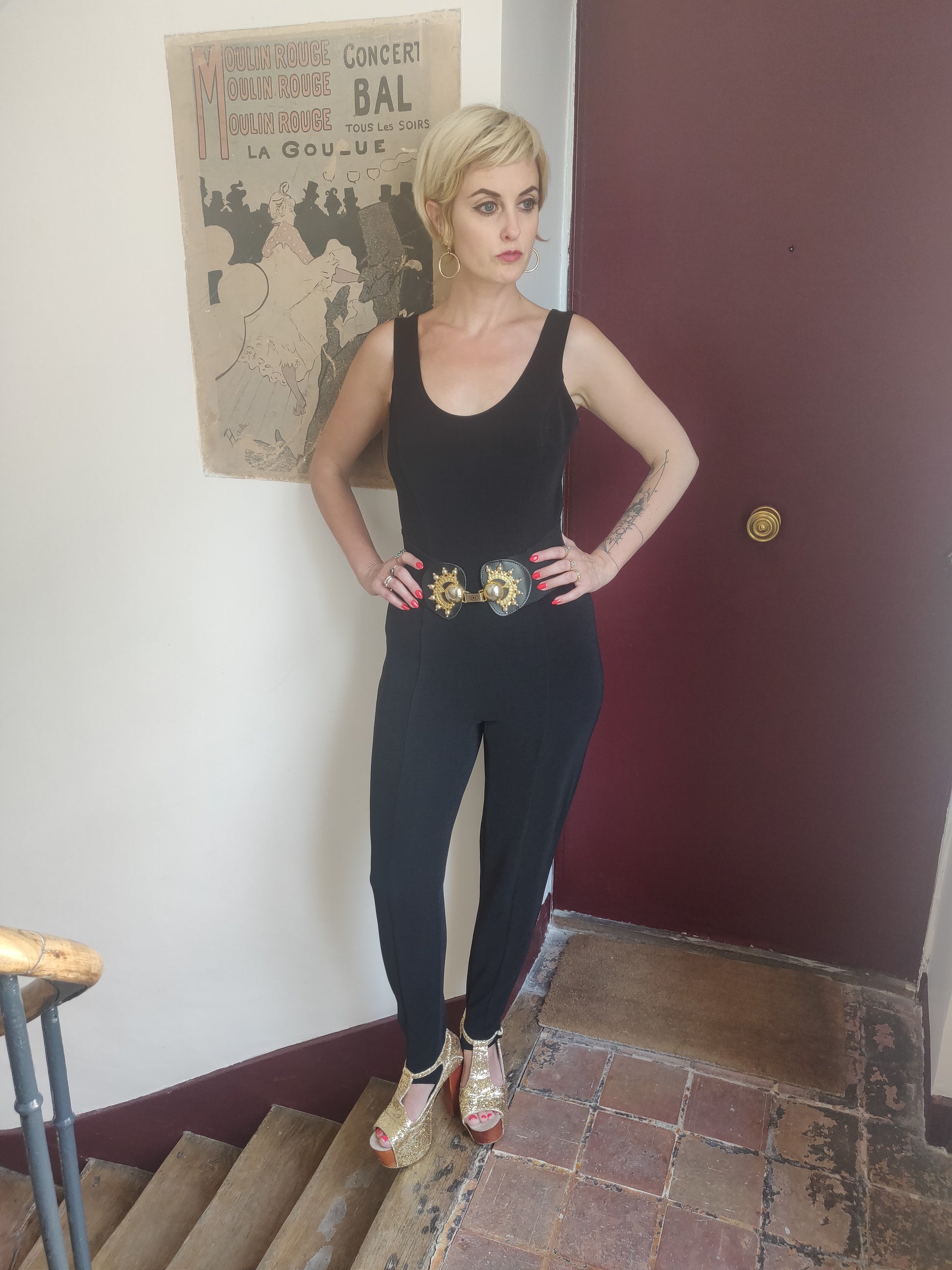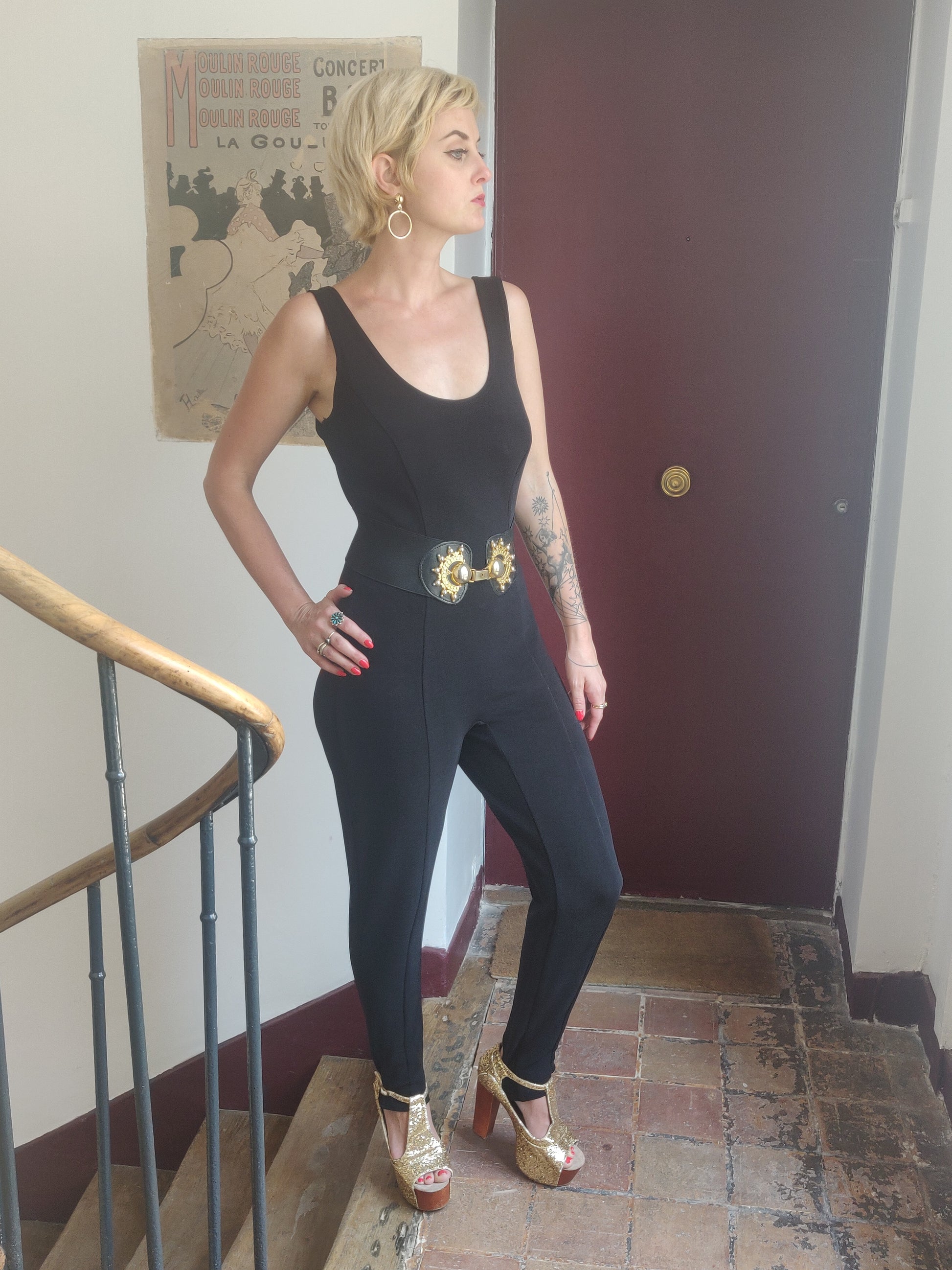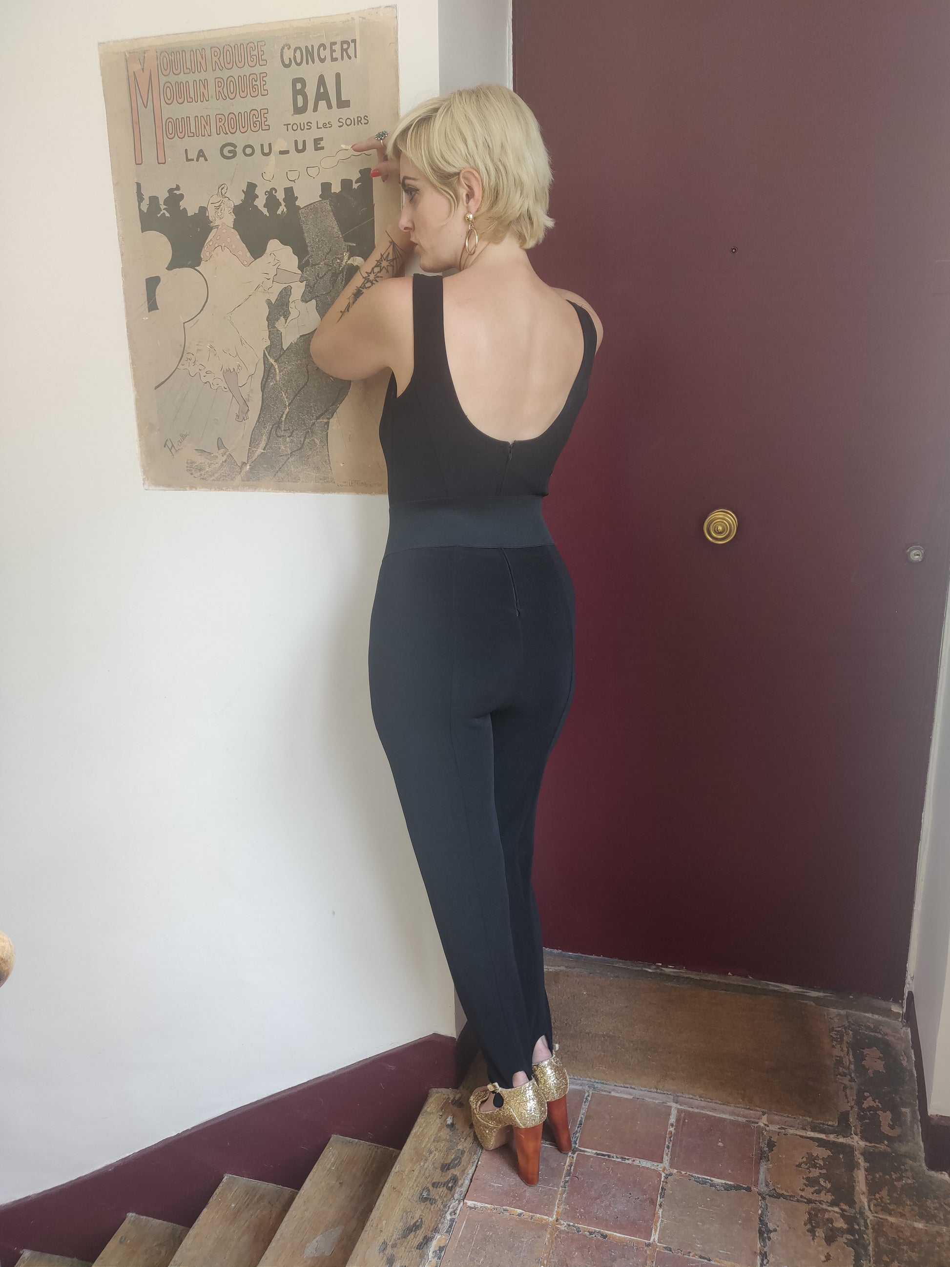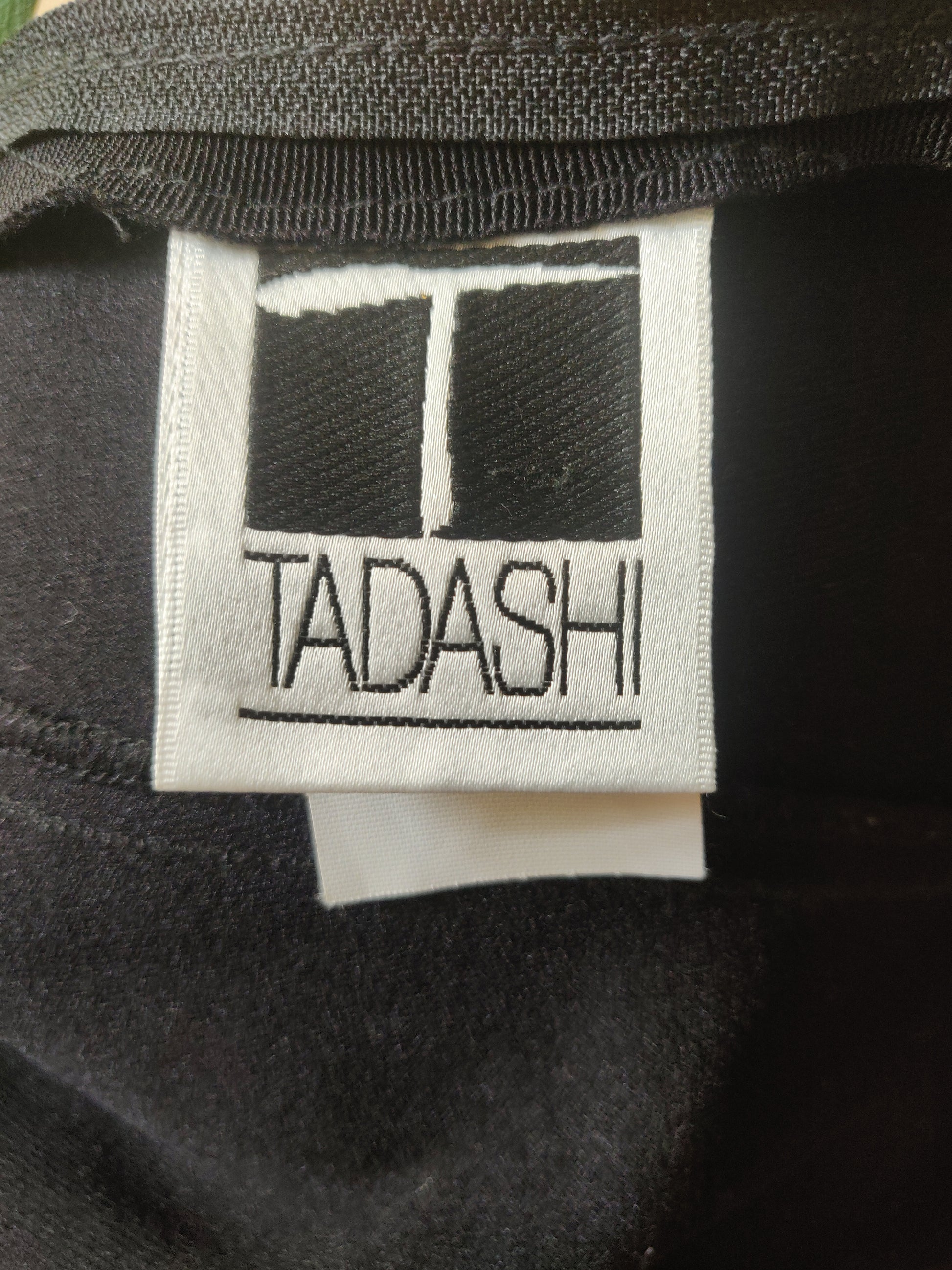This sleek and sexy jumpsuit from Japanese designer Tadashi Shoji is in fabulous condition and ready to find its perfect person.
