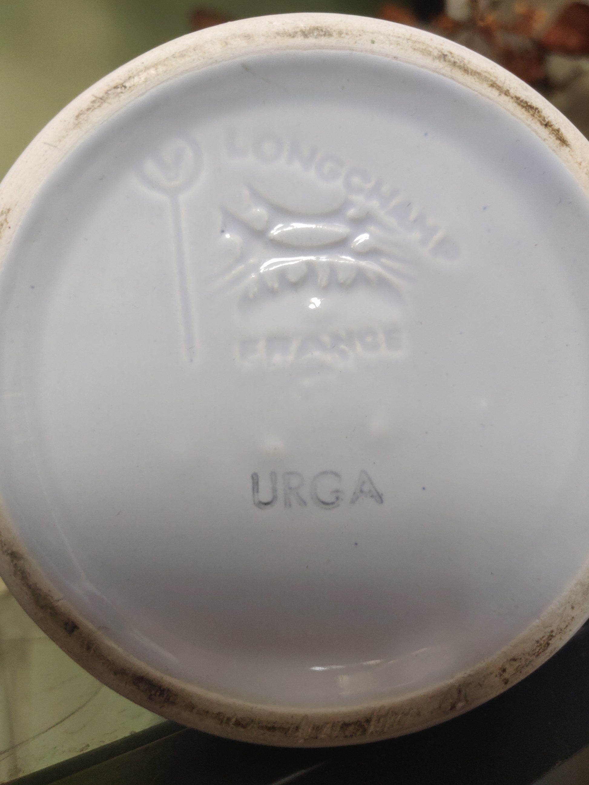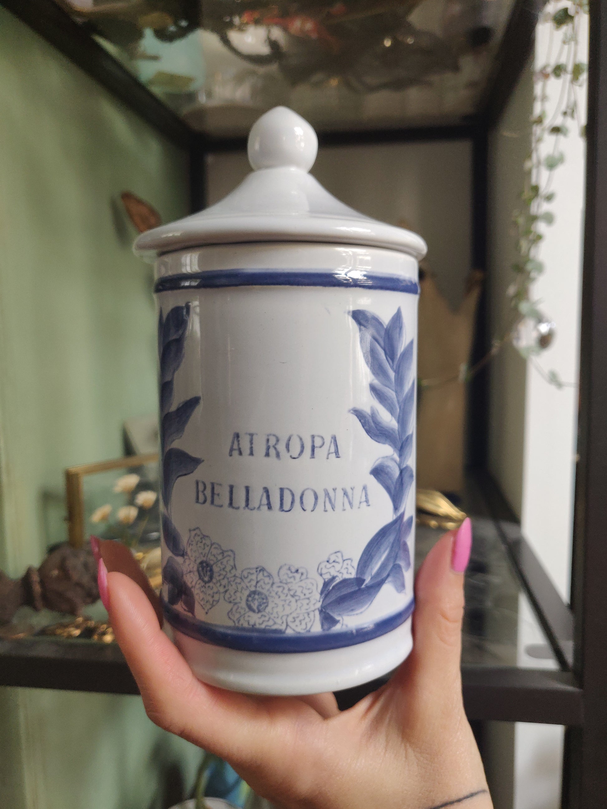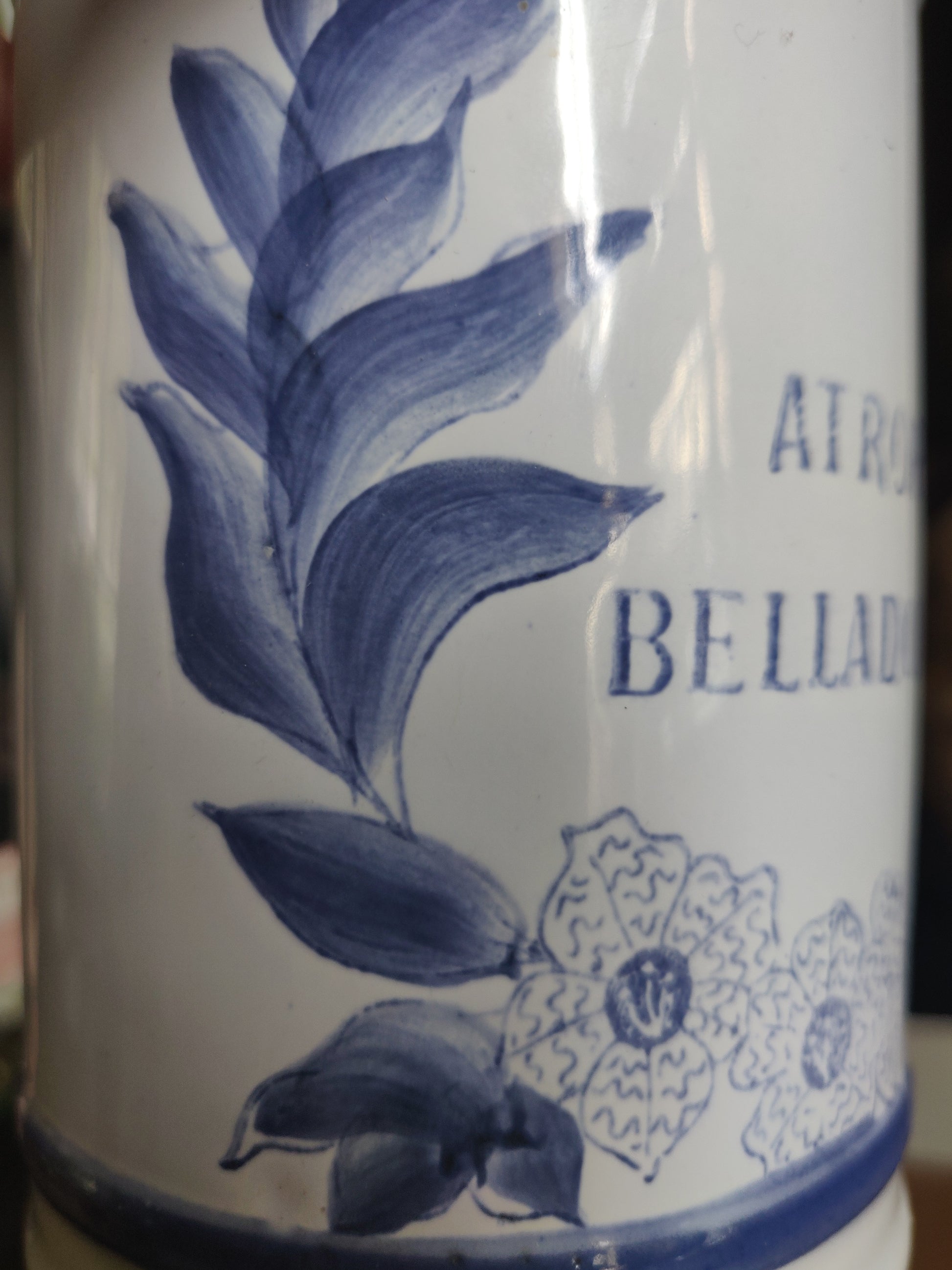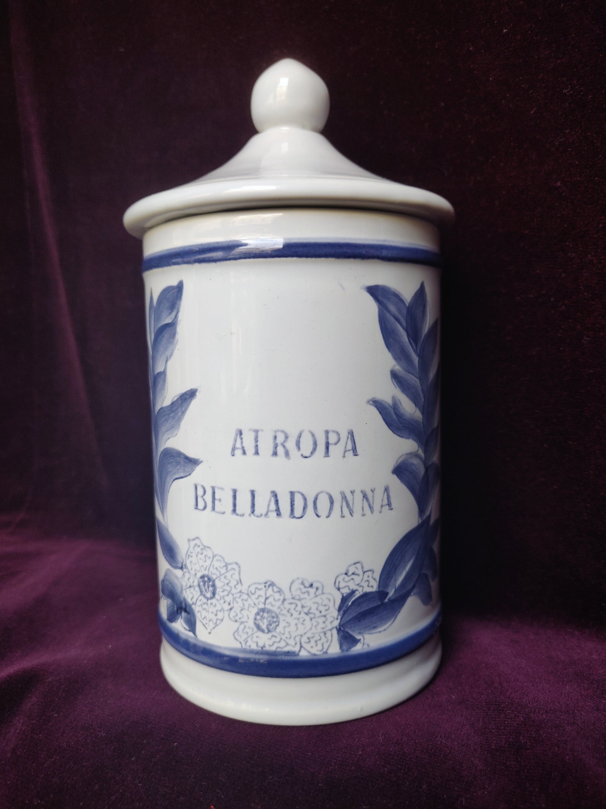 This charming pharmacy pot was made by Longchamp France. It's made of white earthenware and its pretty motif is painted in blue, depicting flowers and leaves and the words "atropa belladonna", also known as deadly nightshade.