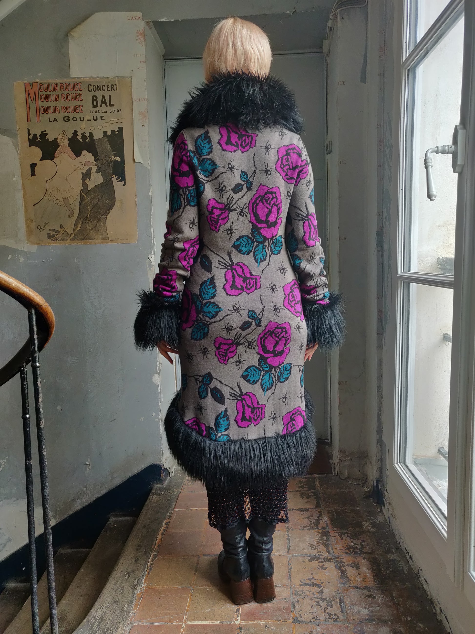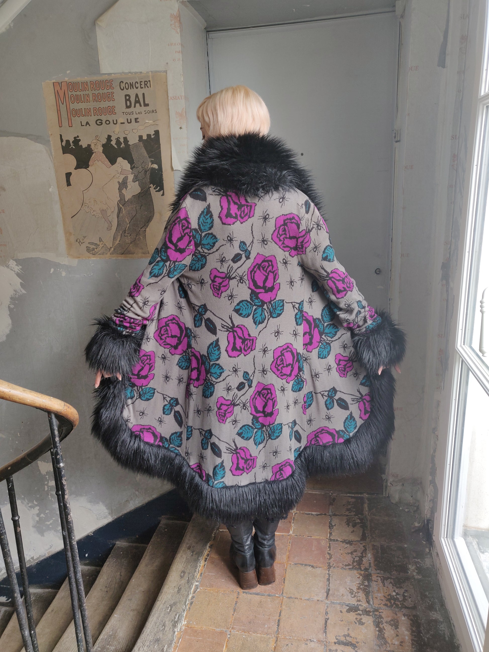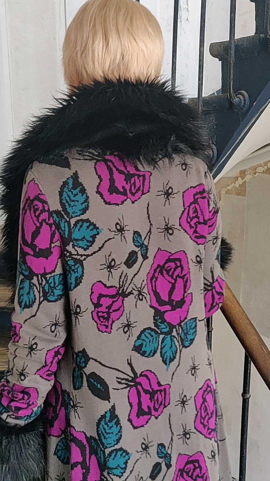How absolutely fabulous is this Betsey Johnson knit duster coat!?! With its magnificent motif of spiders and roses and the deep black faux fur trim, I am drooling over this piece. If it was my size I'd definitely be hanging on to it. But she is not destined for me. So who will be the lucky one? 👀