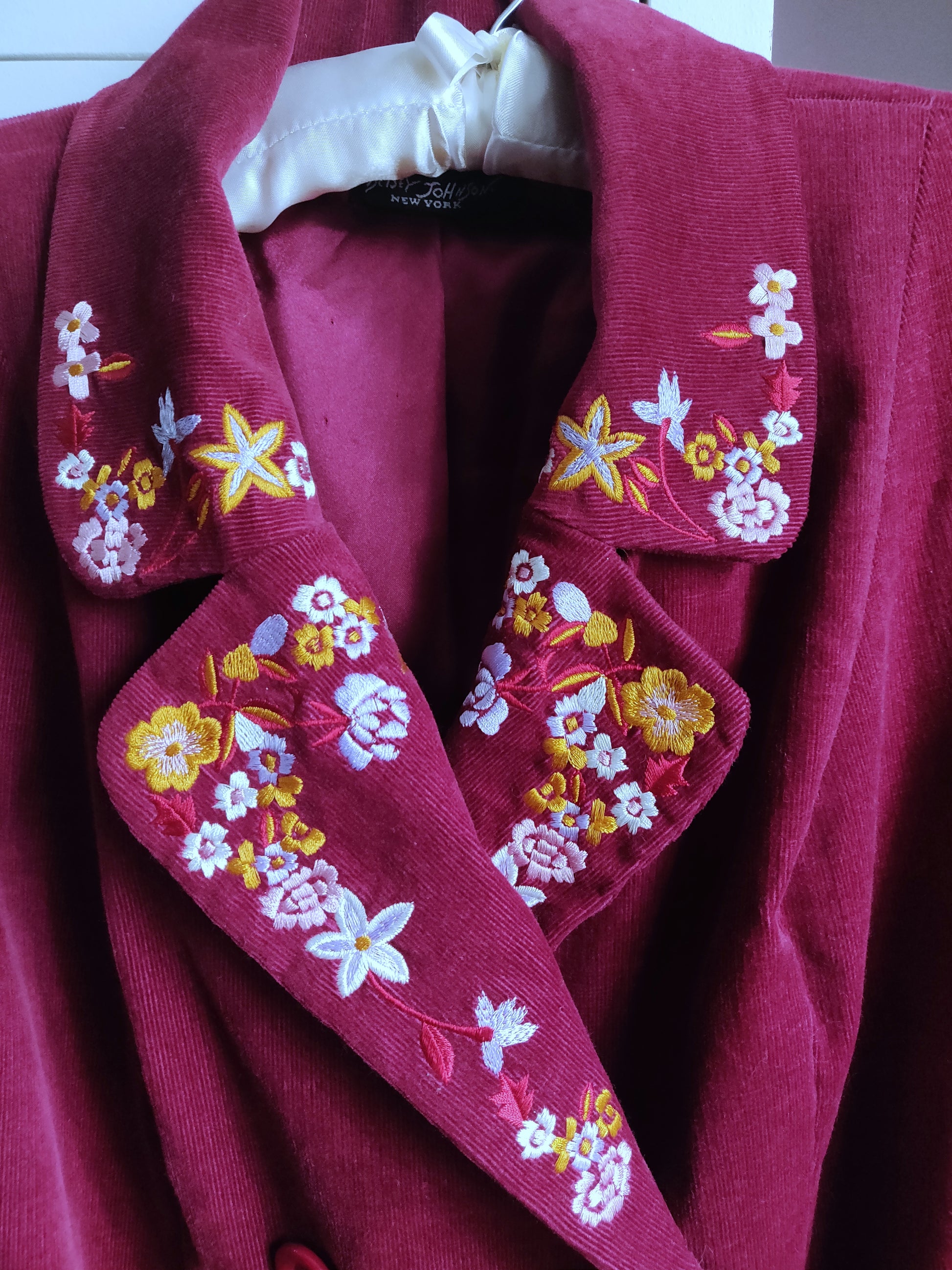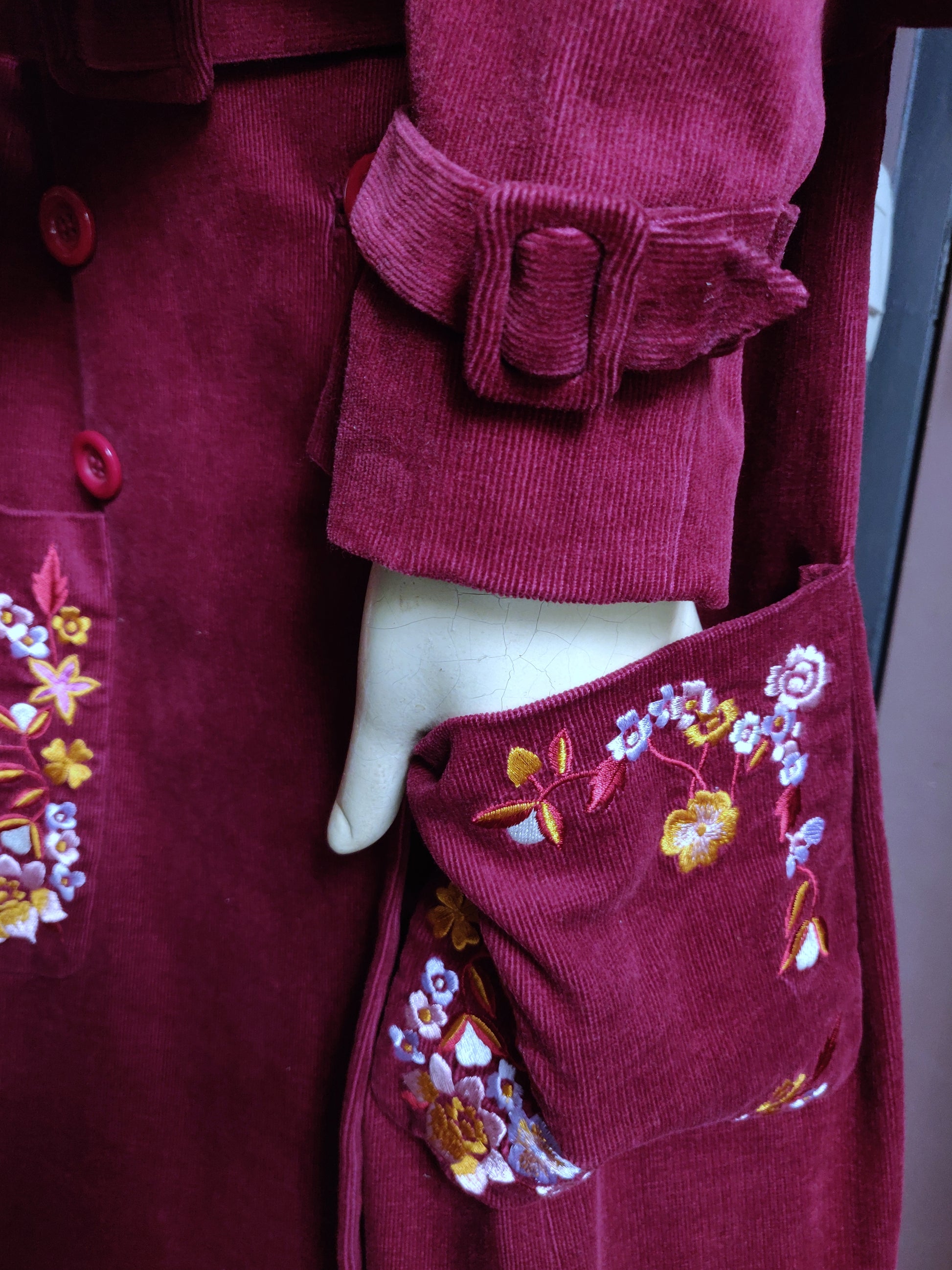 It has lovely floral embroidery on the collar and the pockets and is in pristine condition. It's even machine washable!