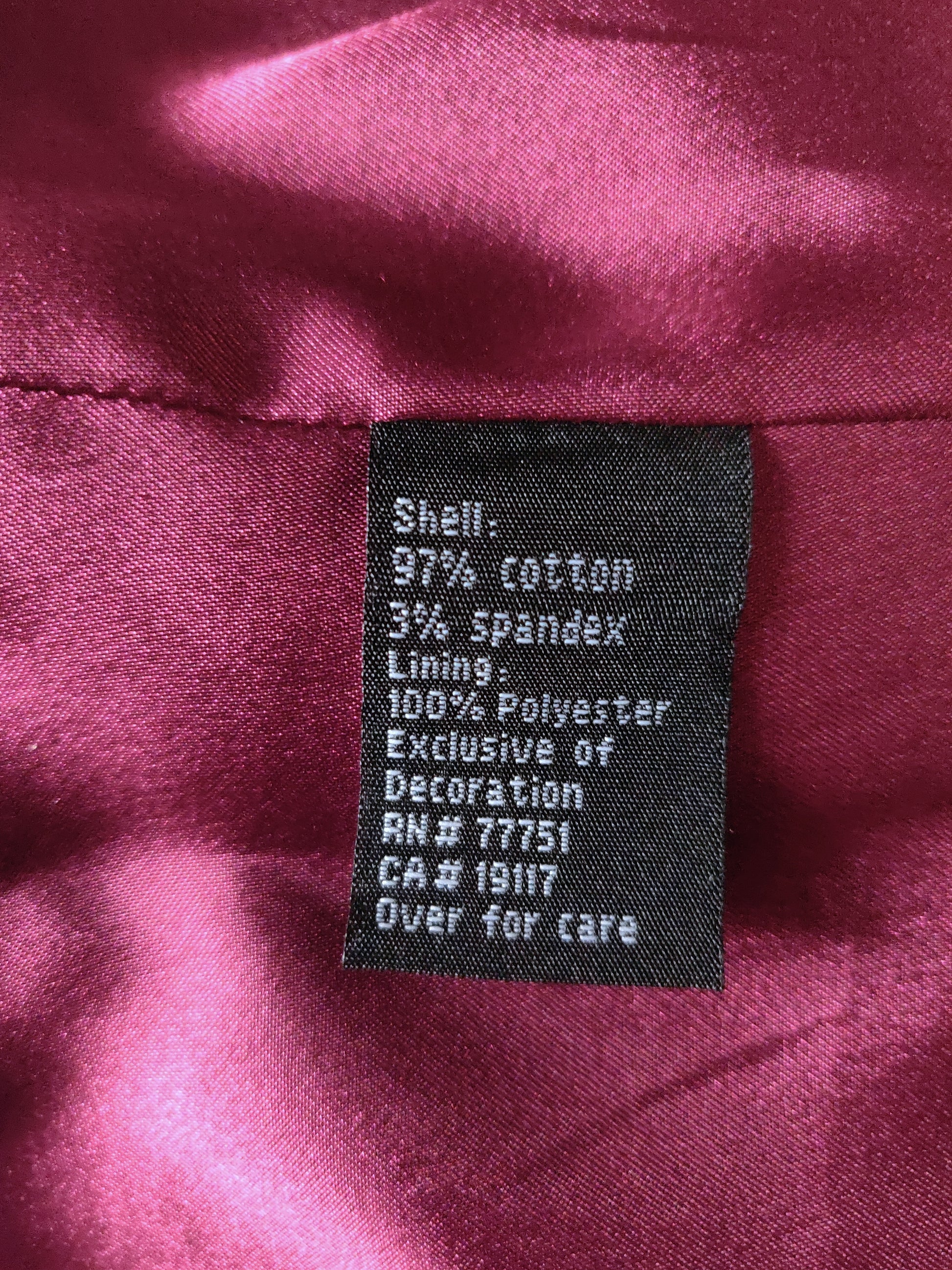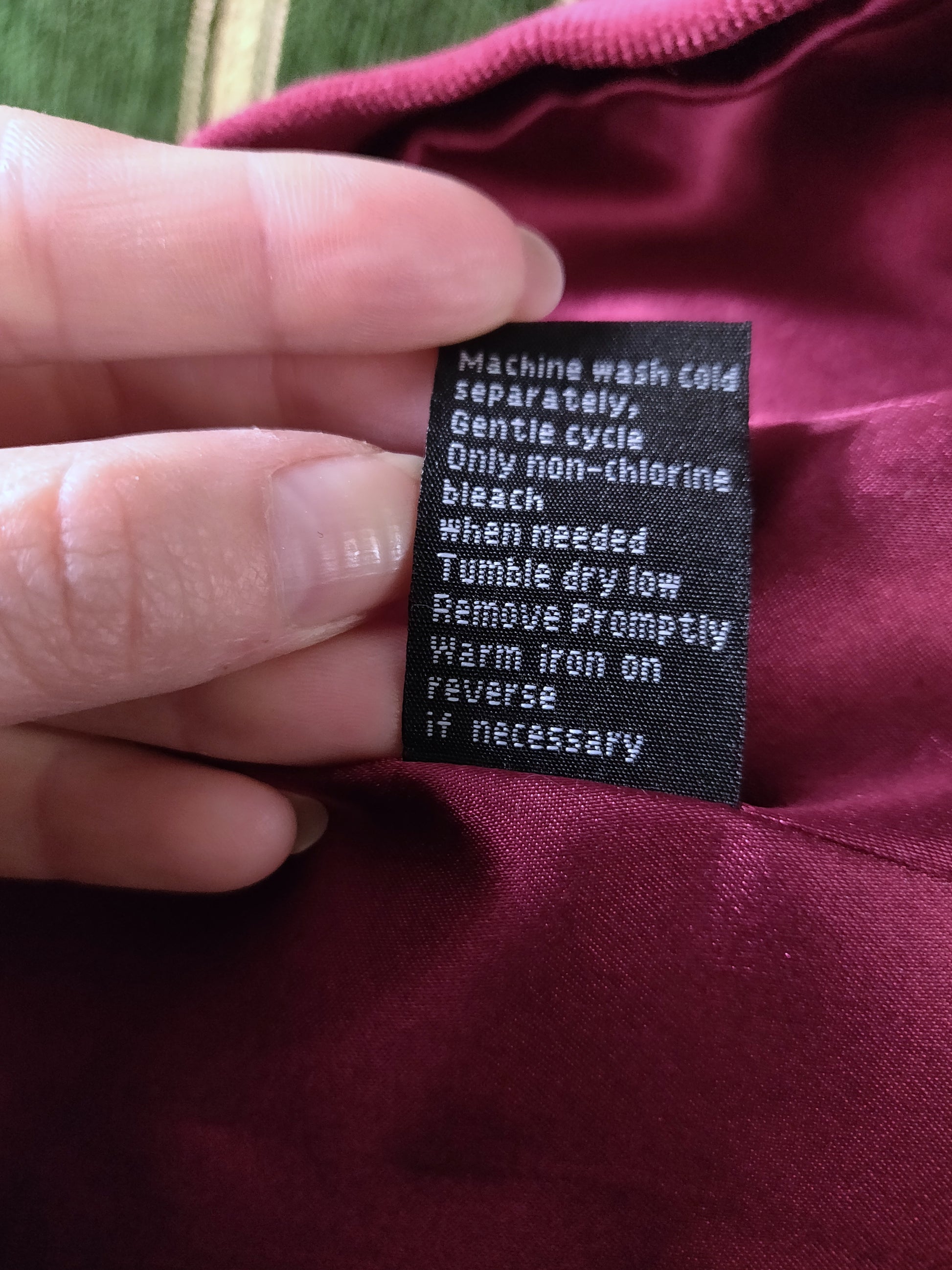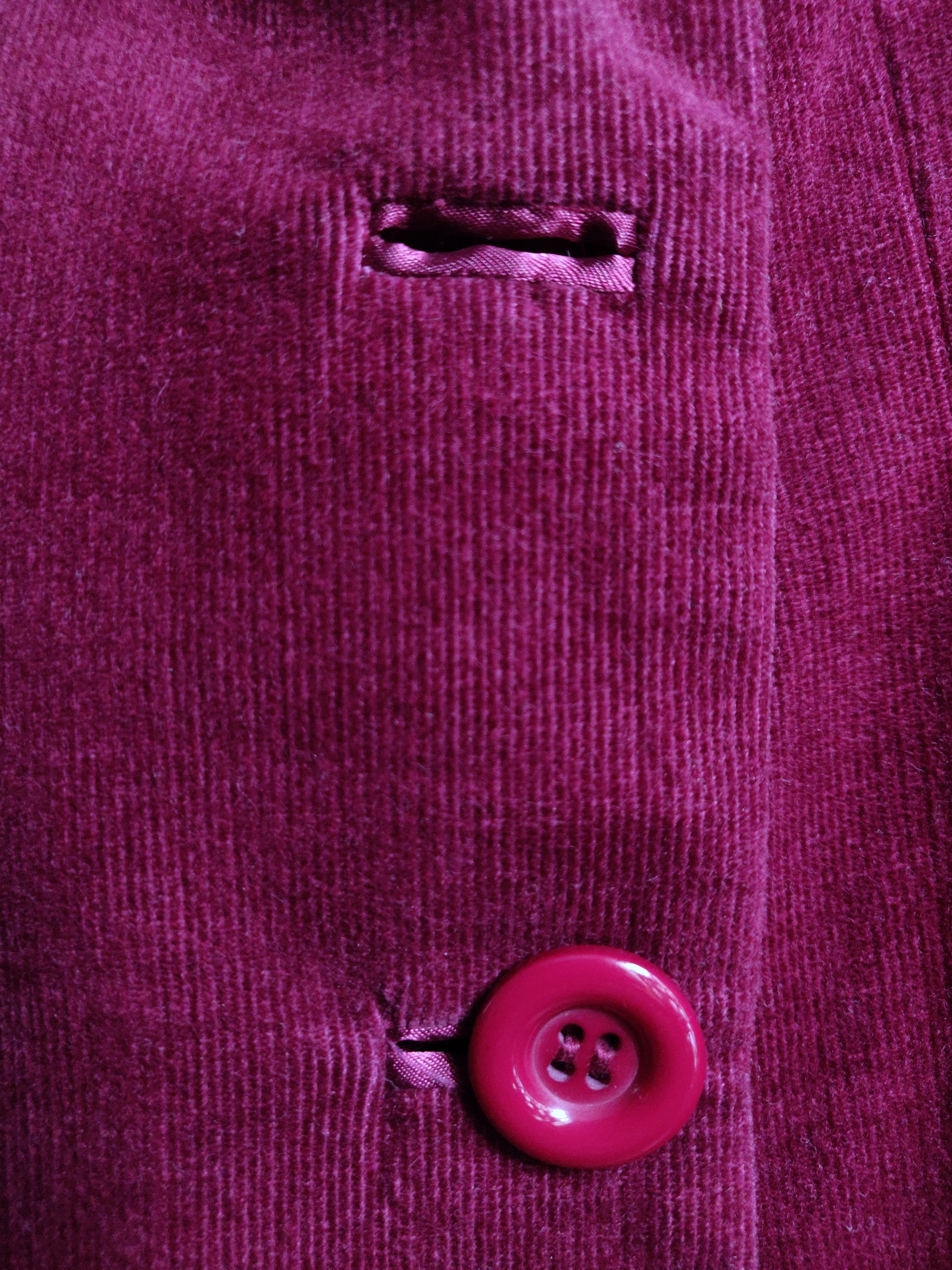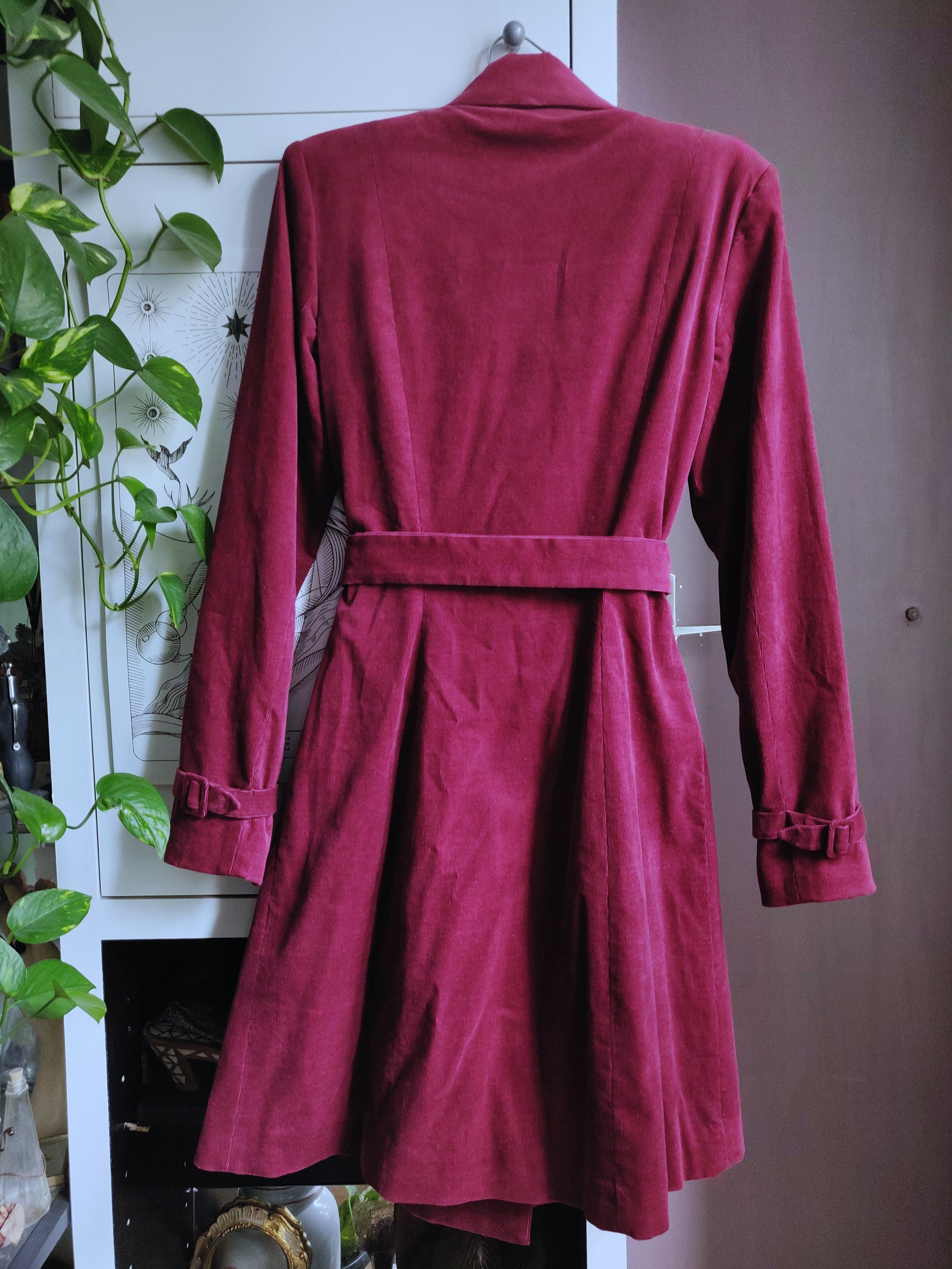It has a full satiny lining, slightly padded shoulders, a double breasted look featuring 8 cherry colored buttons with bound buttonholes (always a sign of thoughtful tailoring), a matching belt and a pocket on each side.