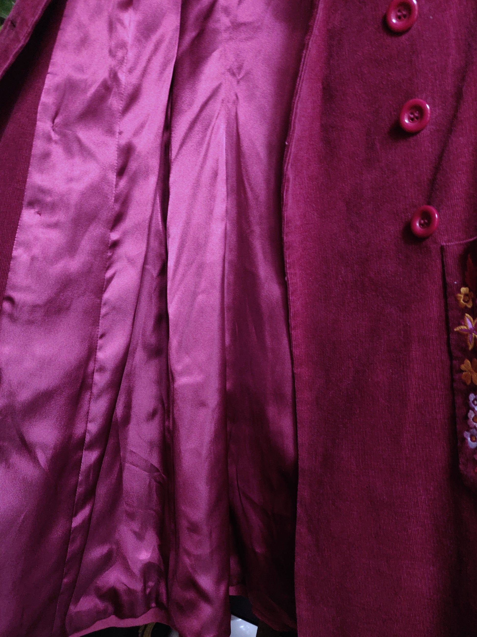 This beautiful burgundy Betsey is made of a lightweight cotton corduroy that is perfect for a mid-season coat.
