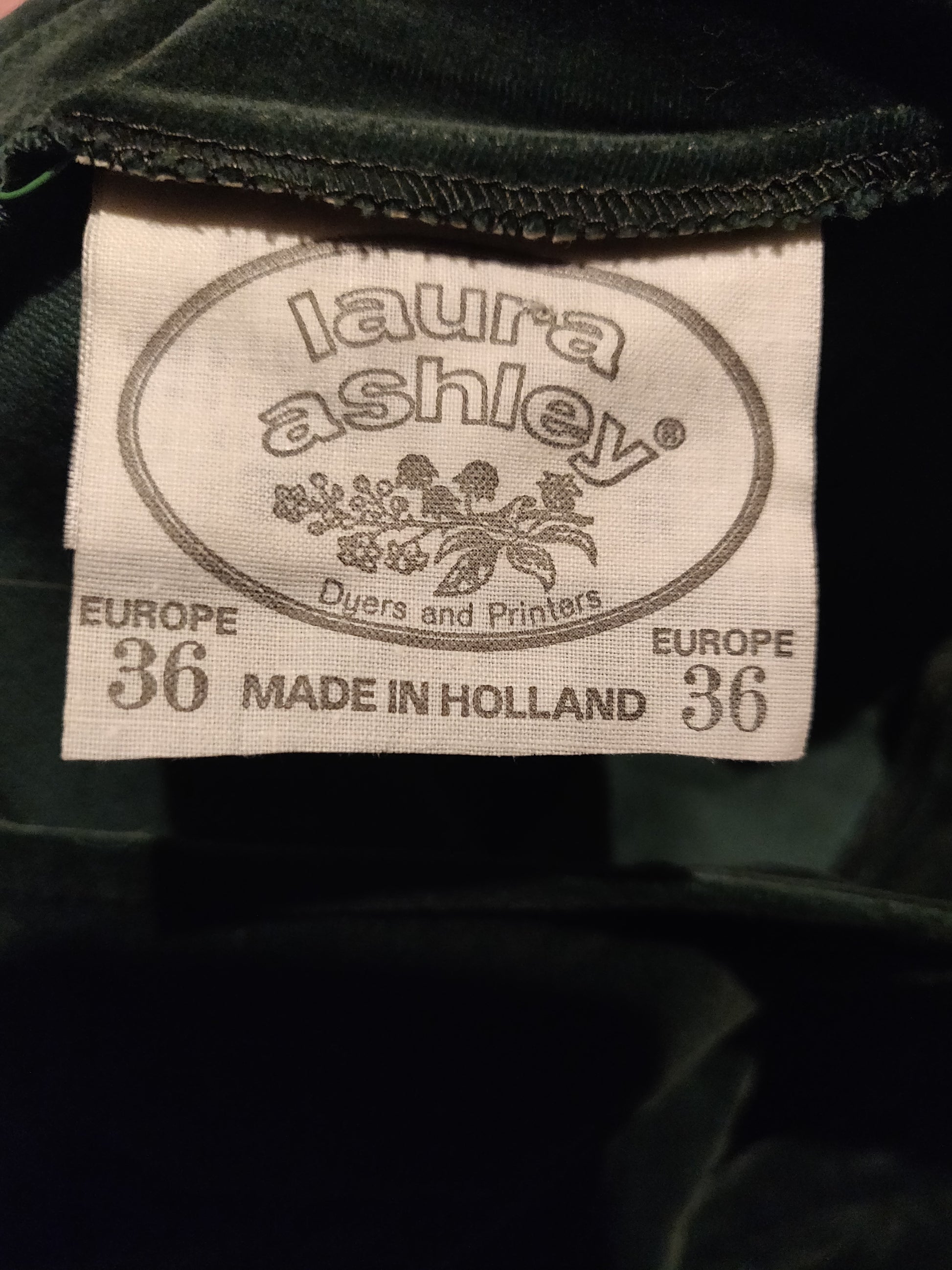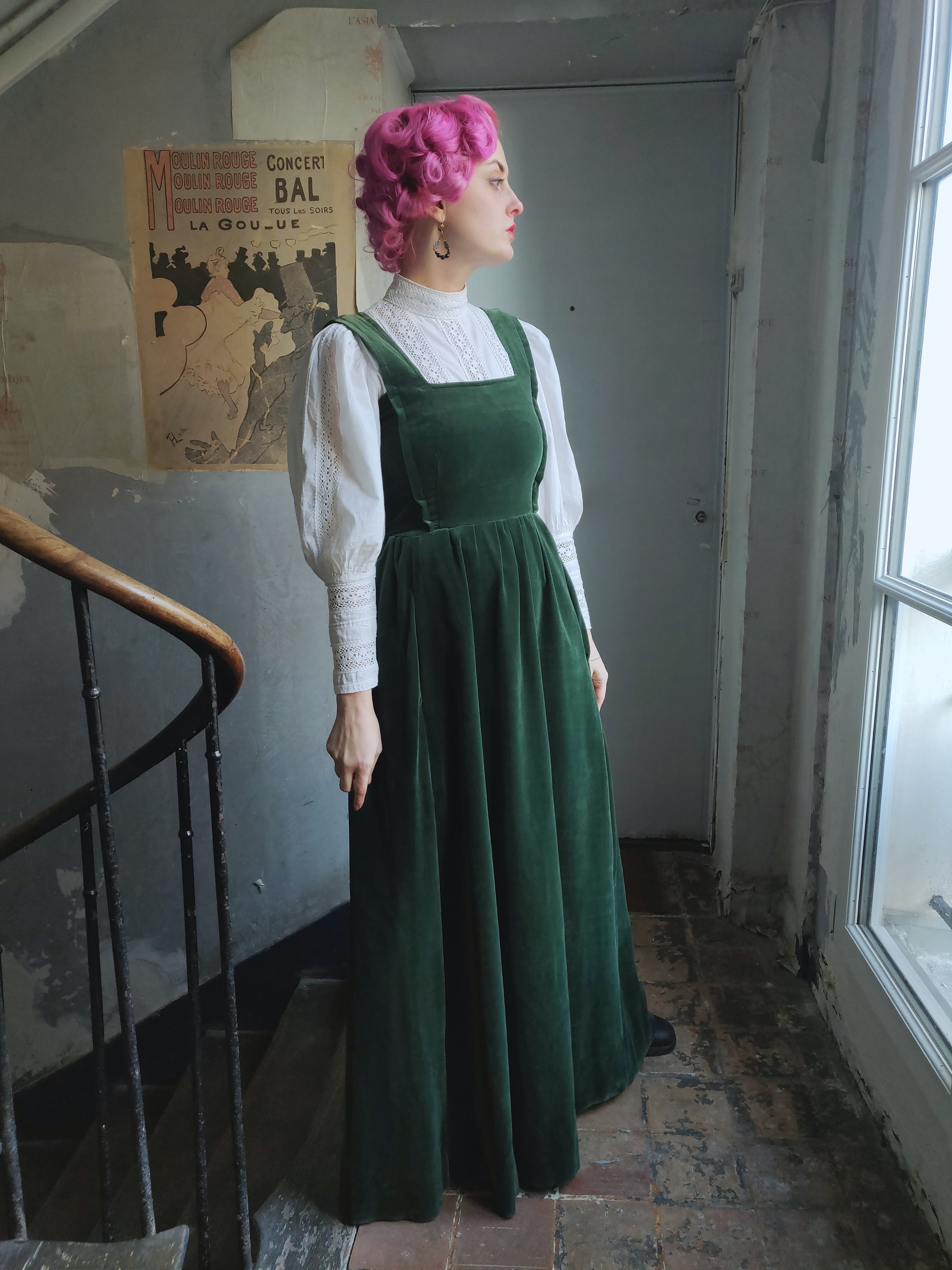 1970s Laura Ashley Green Velvet Pinafore Dress