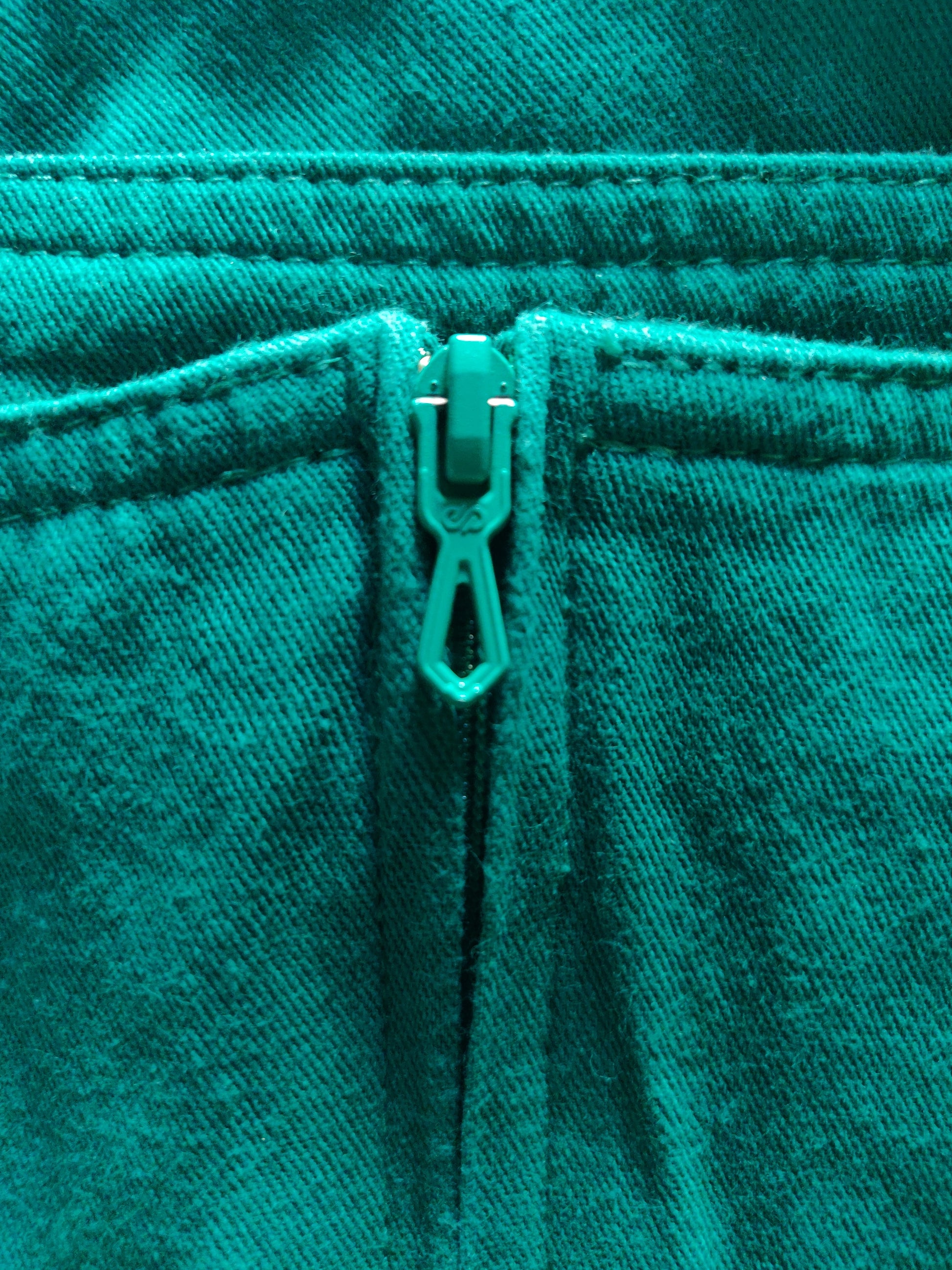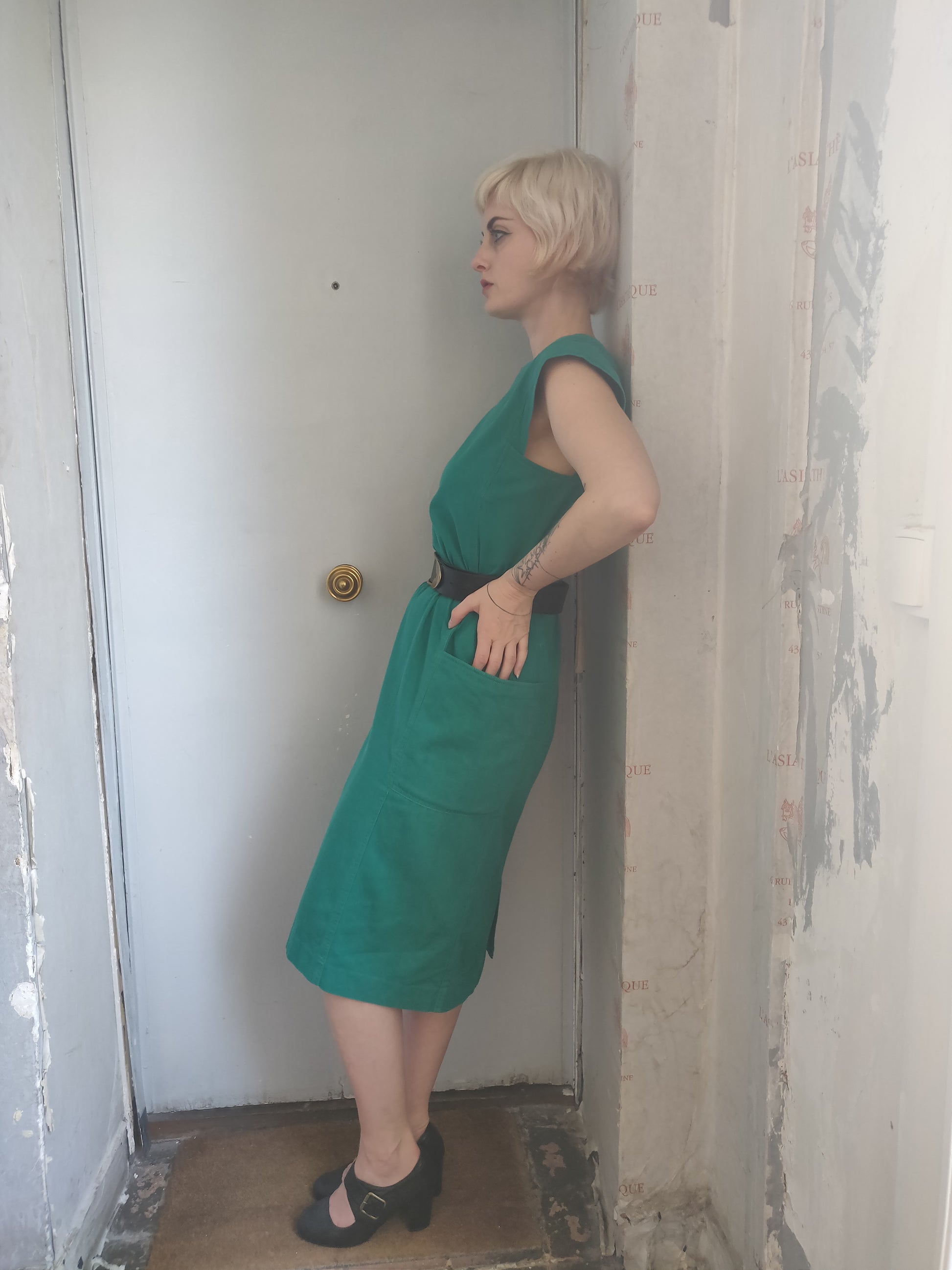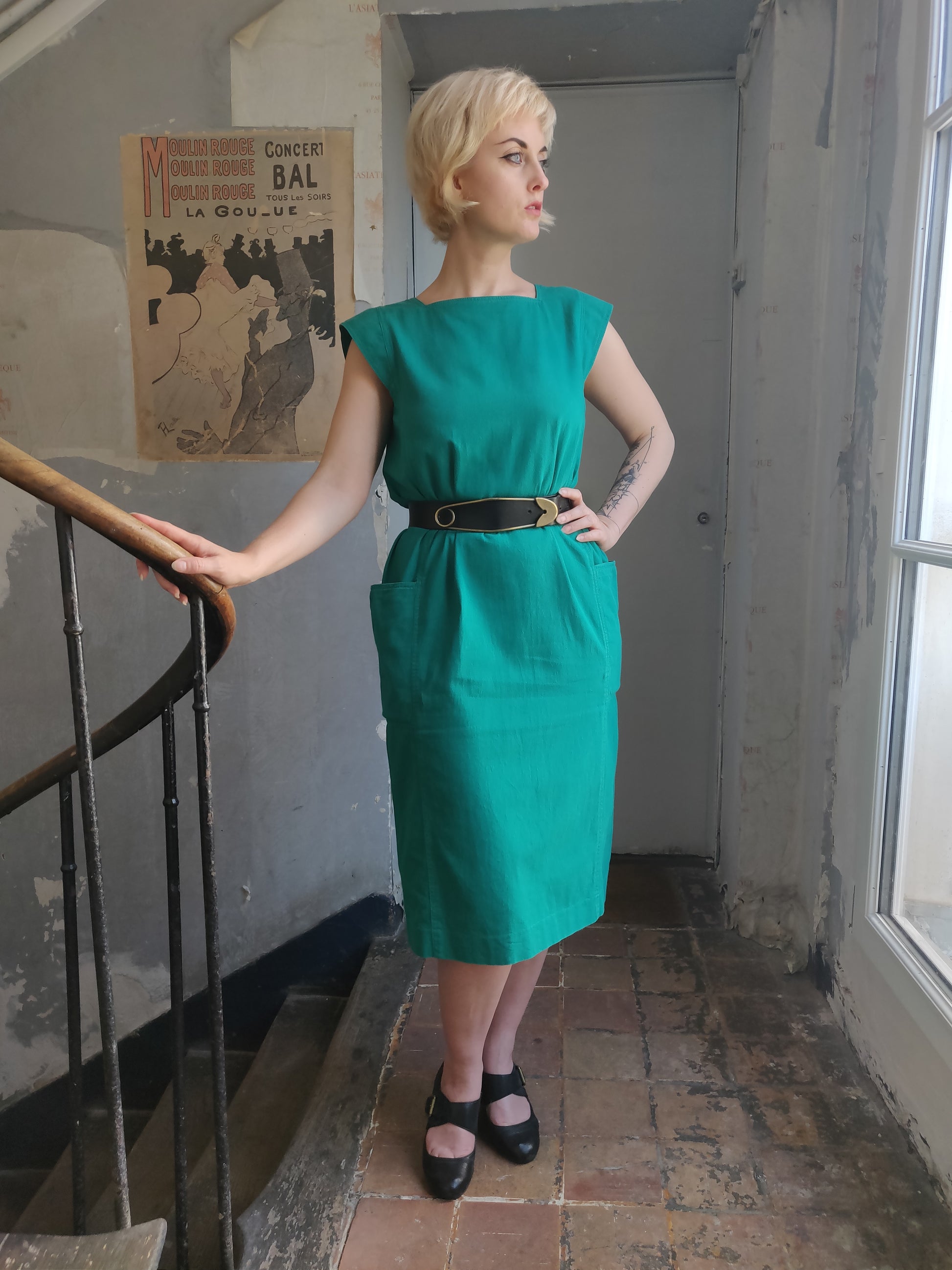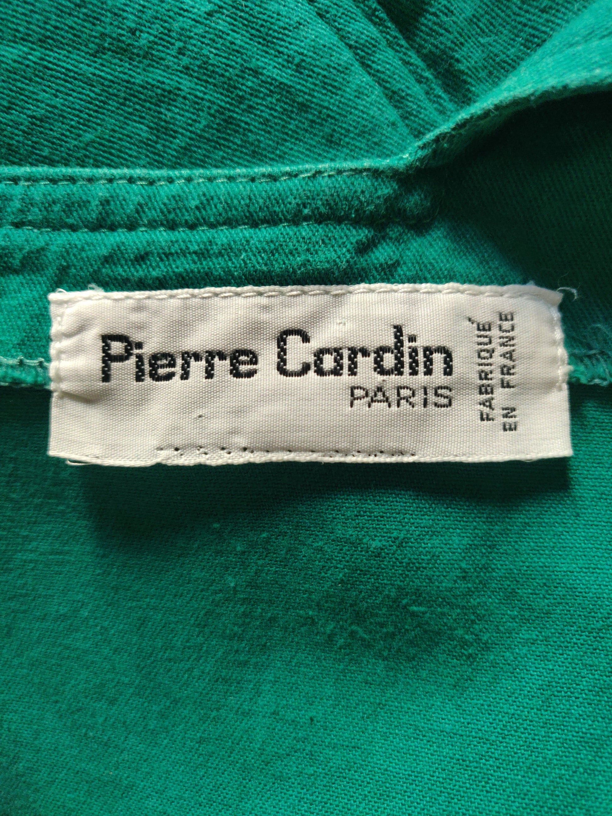 This pretty little teal green summer dress from Pierre Cardin is probably late 70s/early 80s, but clearly draws inspiration from the sweet and simple cuts of the 1950s. There is no composition label but it feels like cotton. It has two large pockets and is soft and comfortable. It comes with a matching fabric belt, which is not depicted in the photos.