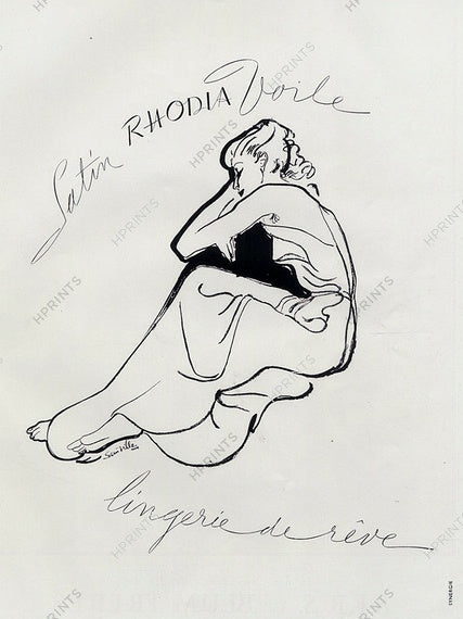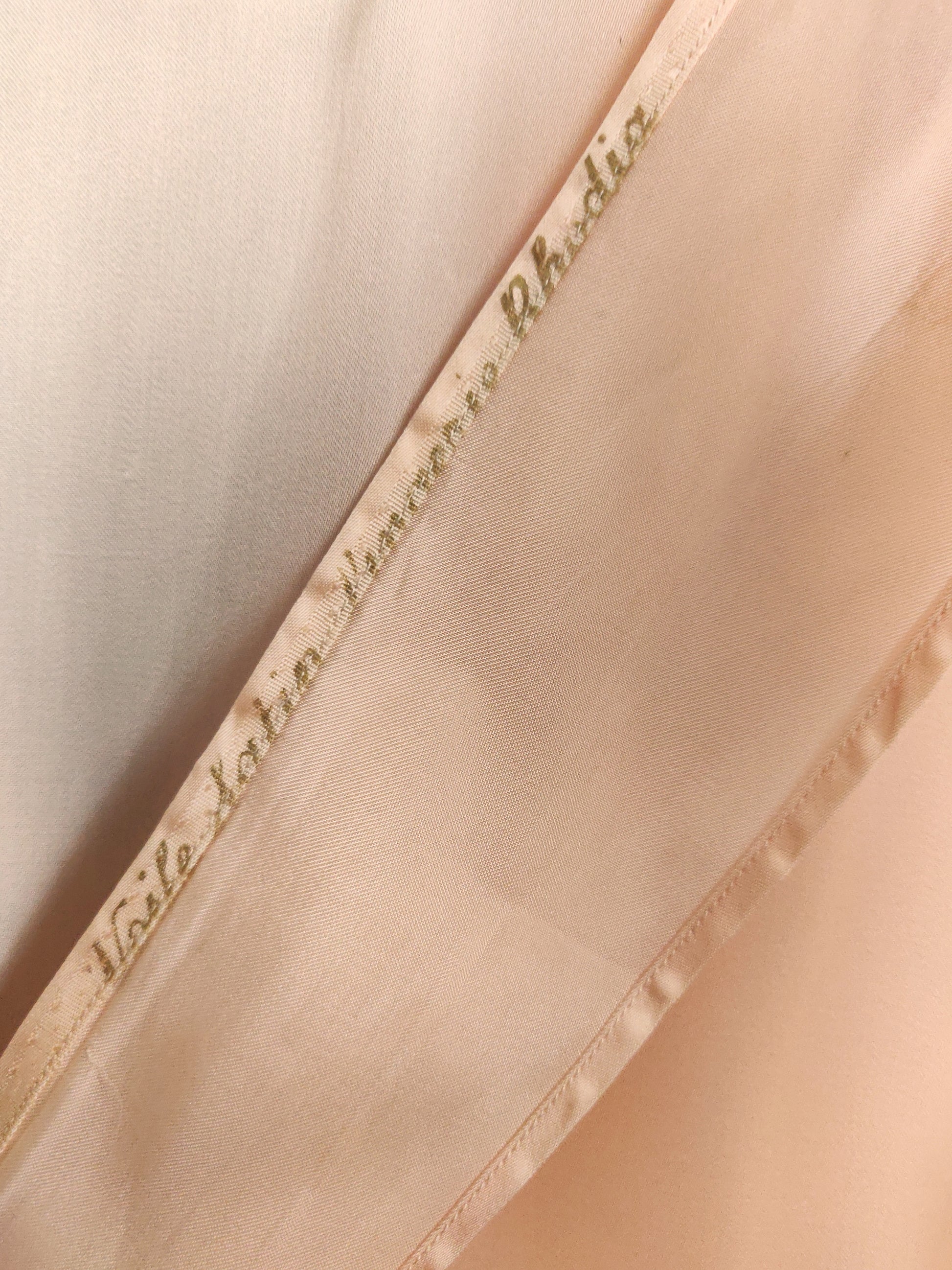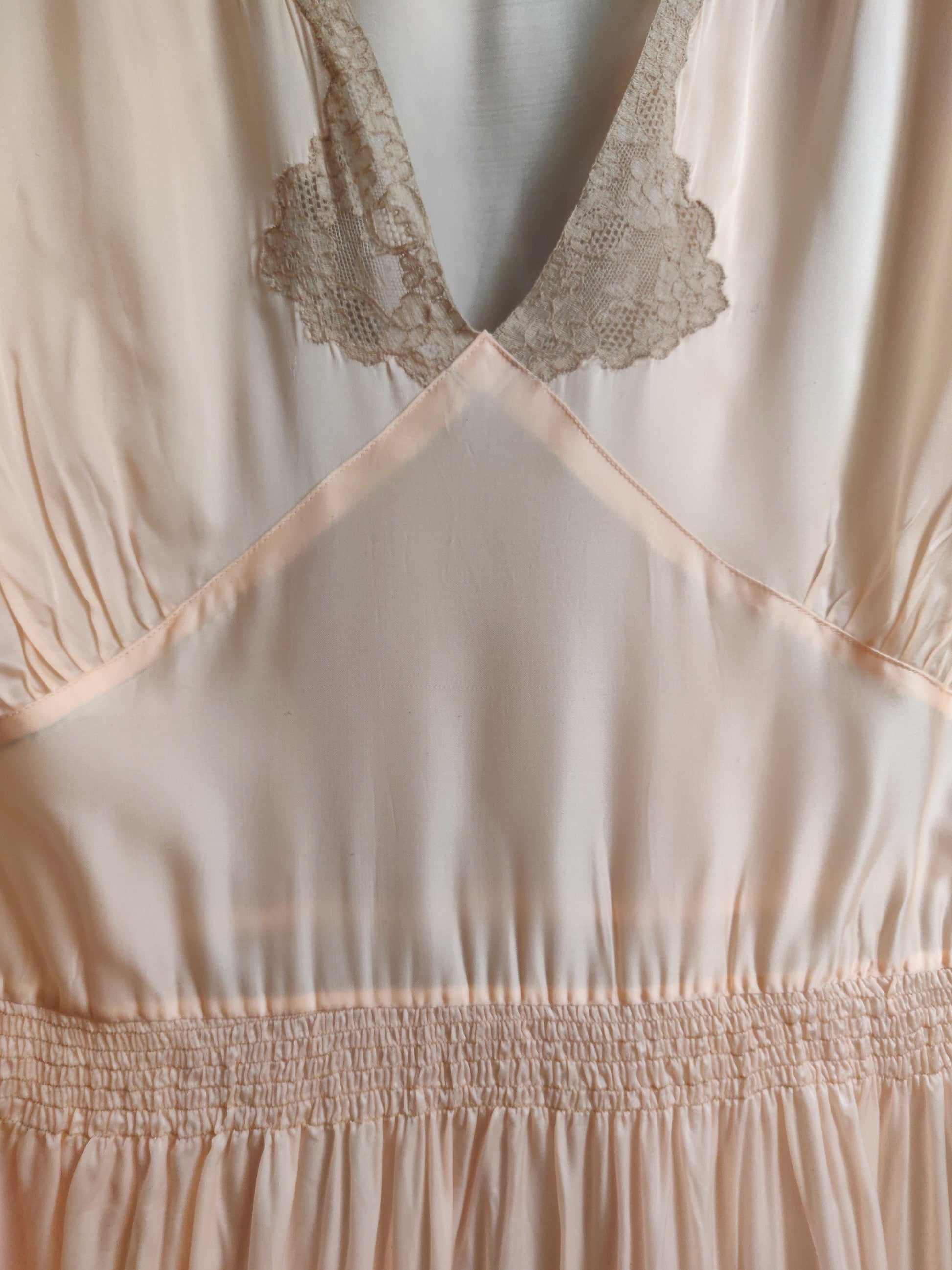 This 1950s sleeping beauty is made of a glowing peachy pink-colored satin material. The neckline and armholes are trimmed with bits of lace, and the shoulders and the front of the waist are delicately shirred. It ties round the back with a stitched-in sash, which is marked "Voile Satin Lingerie Rhodia". I believe Rhodia was a fabric company, or a type of satin made by a fabric company. I found a lovely little drawing for it (photo 9)!
