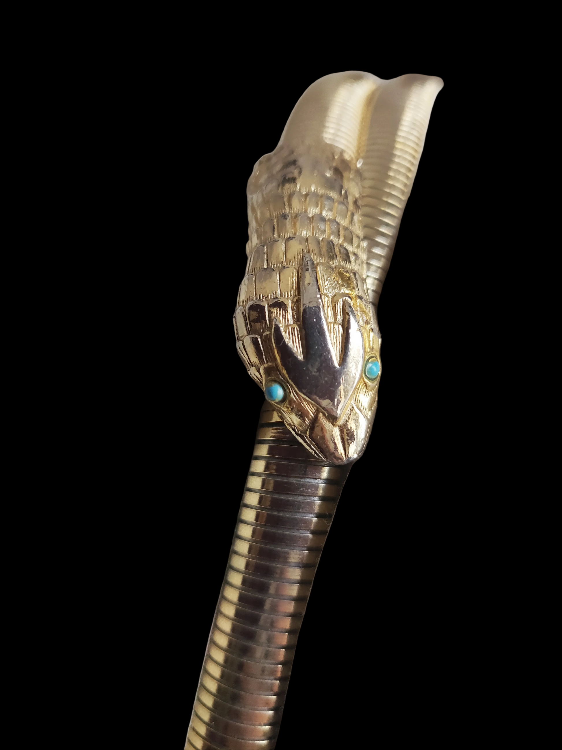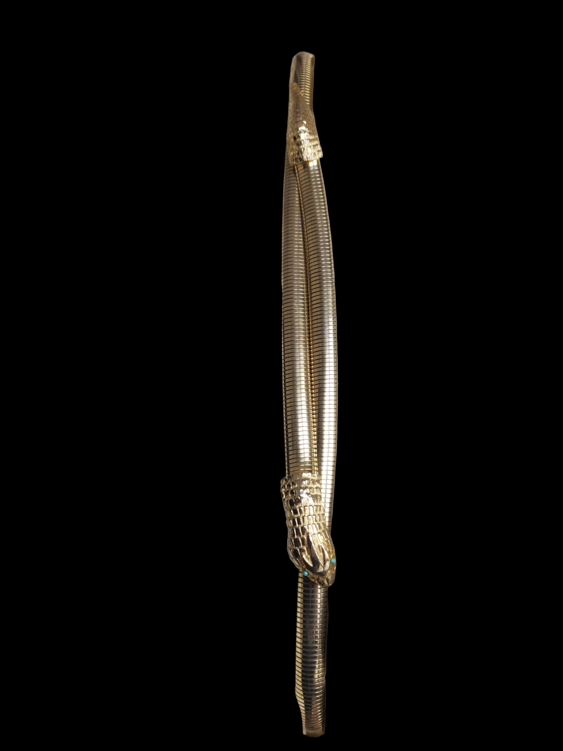 This gorgeous gold-tone snake has turquoise colored eyes and is stretchy.