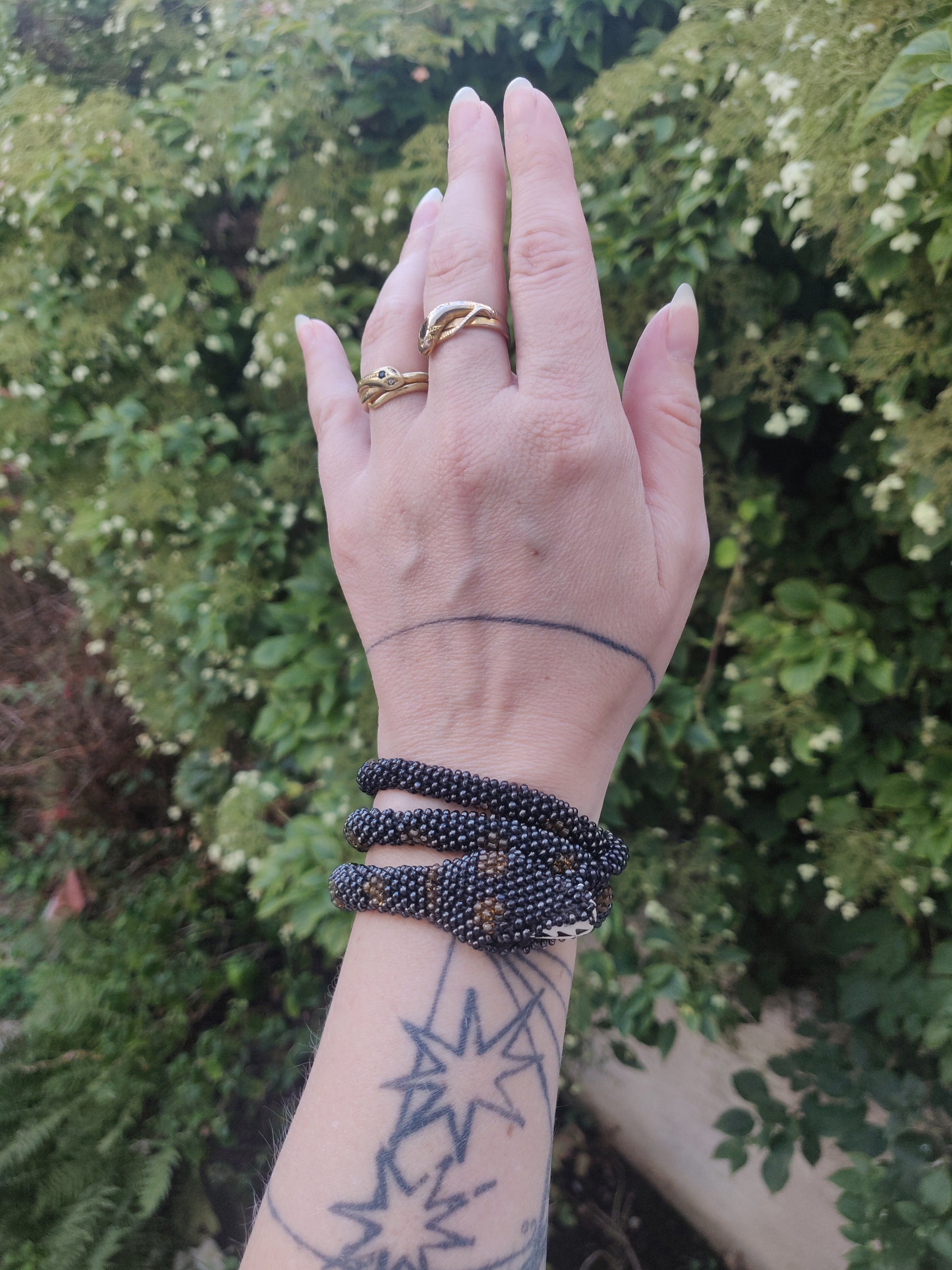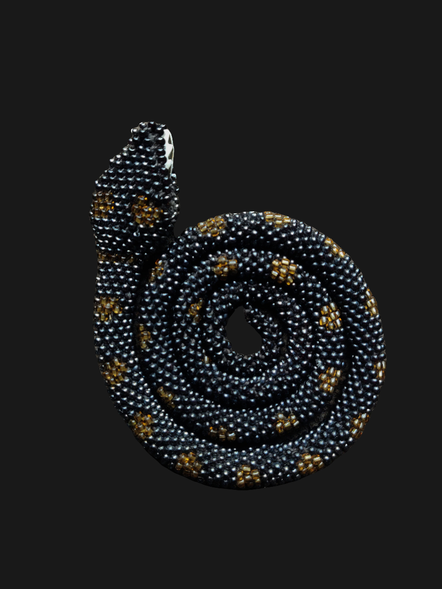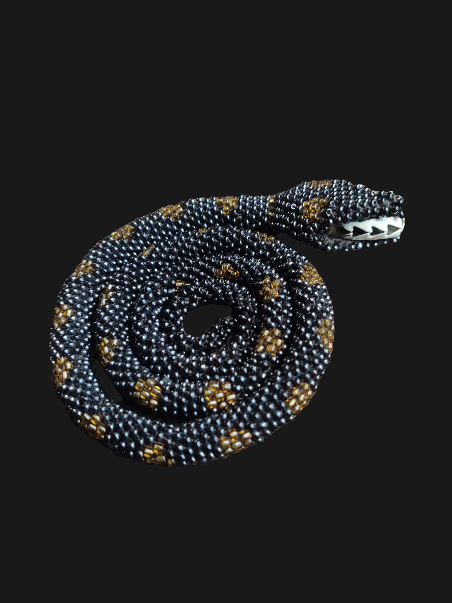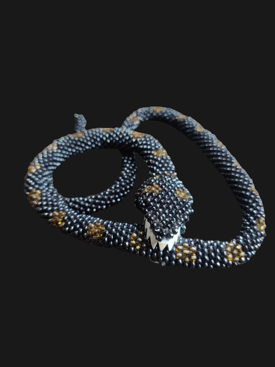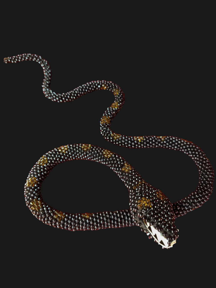 This rare and lovely bead crocheted snake is made with deep brown and amber colored glass beads. It has clamp teeth that bite its own tail to create a necklace or bracelet.
